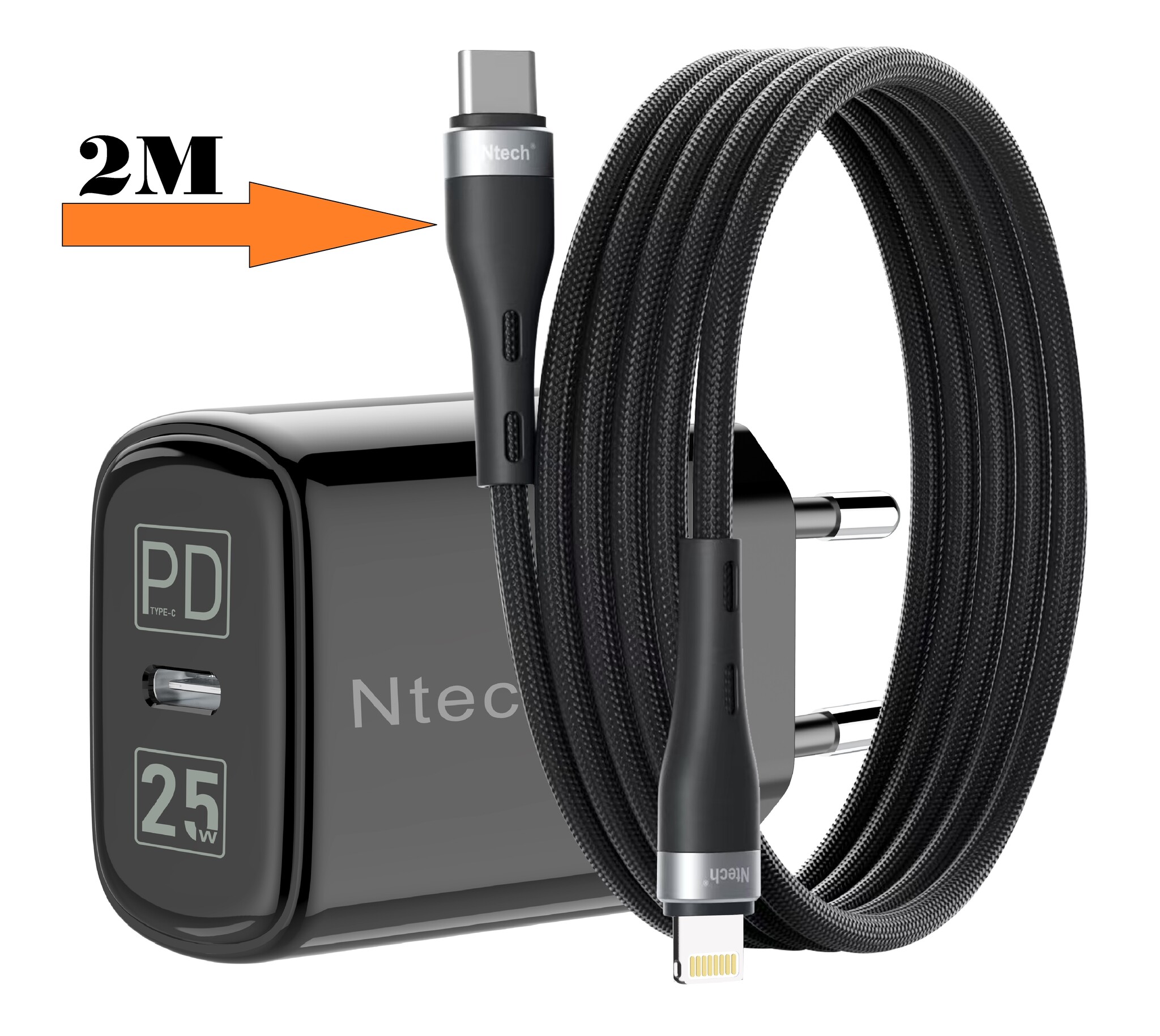 Ntech 25W GaN USB-C Adapter met 2m Nylon USB-C naar Lightning Kabel – Supersnel en Betrouwbaar Opladen voor iPhone