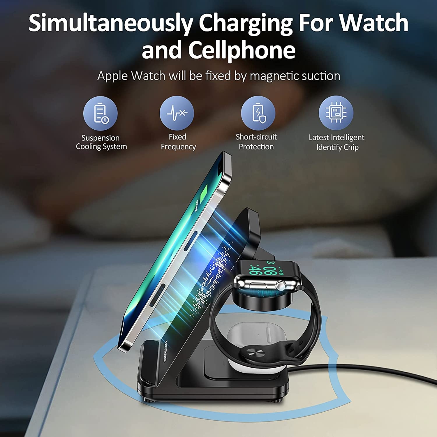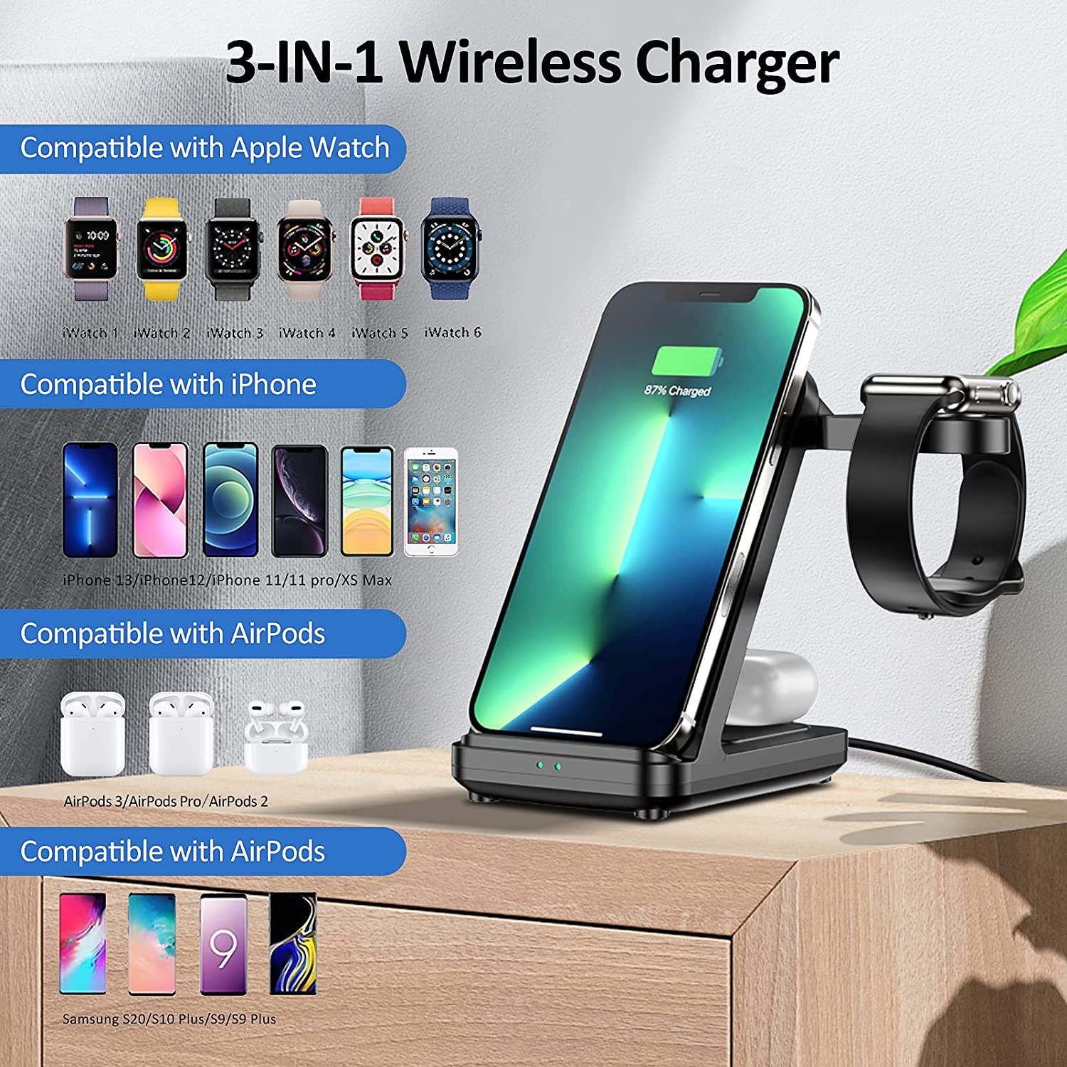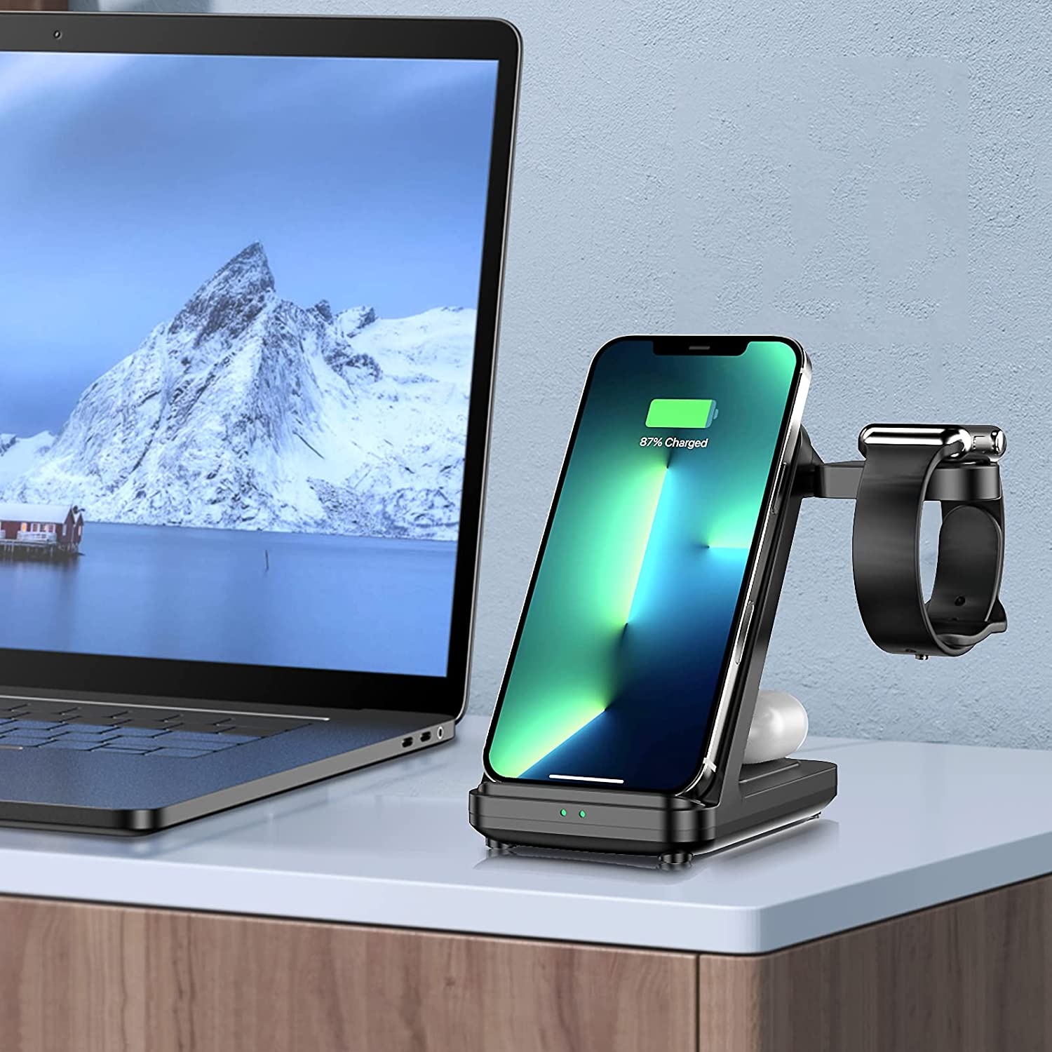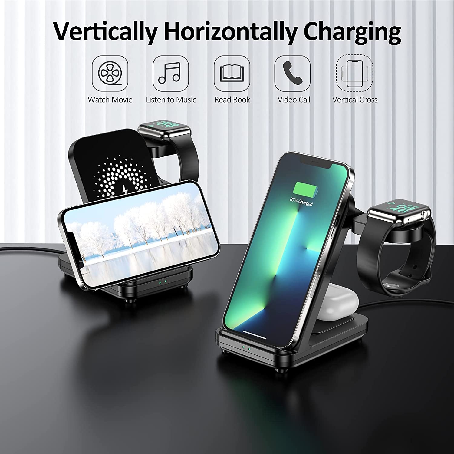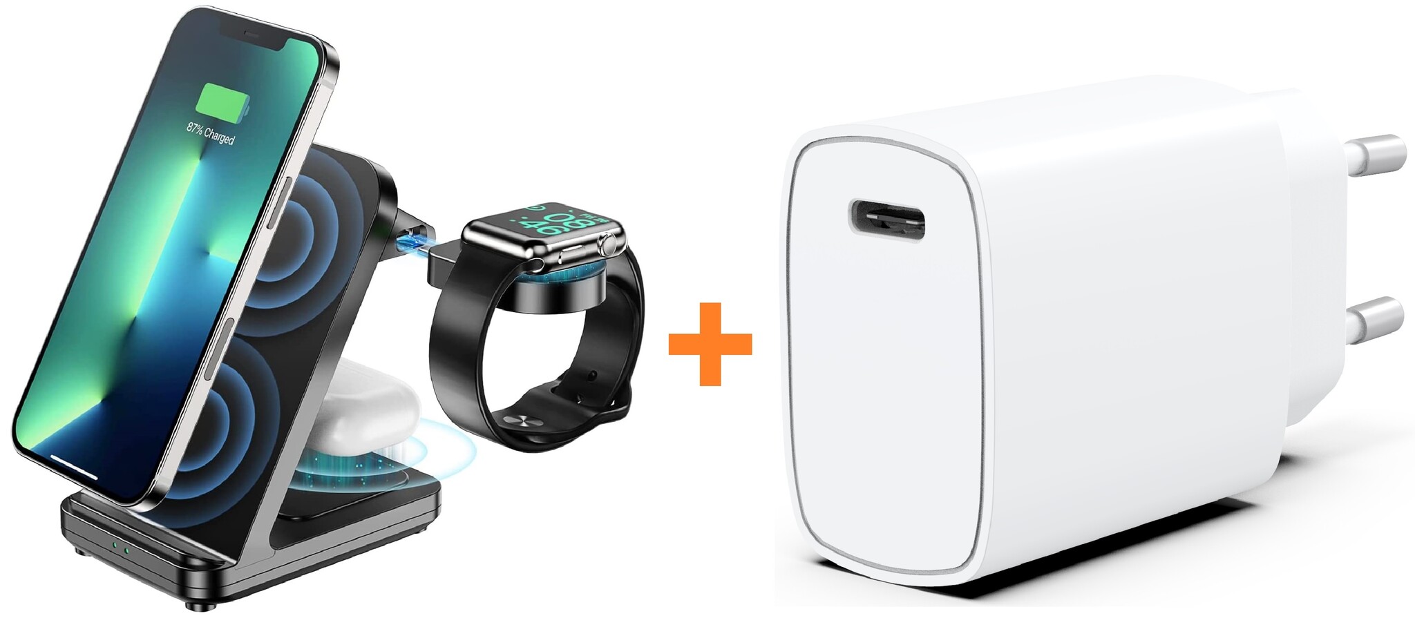 Het opladen is nog nooit zo eenvoudig geweest met deze draadloze oplader 15w fast charger. Dit draadloze oplaadstation is de nieuwe generatie dunne en lichte draadloze oplader. Met deze draadloze oplader laad je drie apparaten tegelijk op. Deze draadloze oplader is geschikt voor alle smartphones, tablets en andere elektronische producten die draadloos opladen ondersteunen. Daarnaast is geschikt voor alle Apple iWatch, Airpods en Xiaomi Airdots en alle andere TWS-bluetooth oordopjes met Type C.