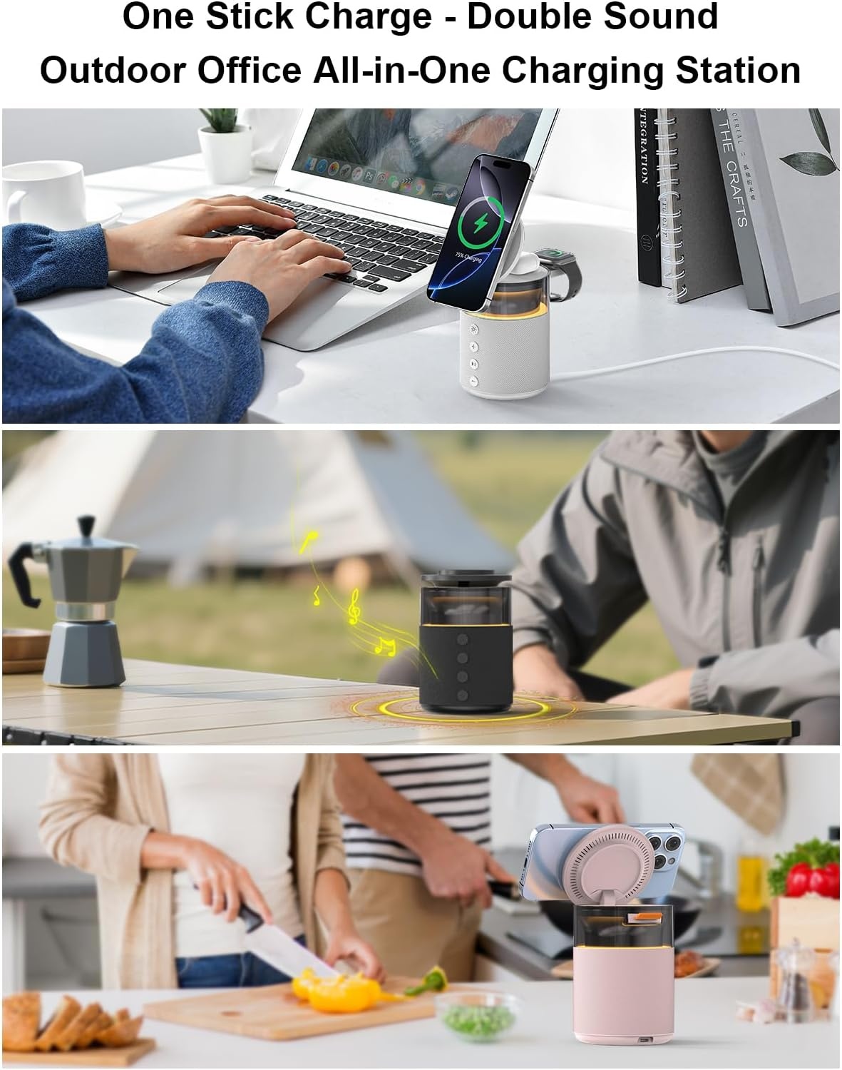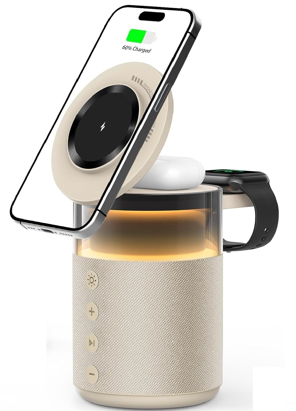 5-in-1 Draadloos Oplaadstation met Bluetooth Speaker, Magnetische Oplader & Nachtlampje