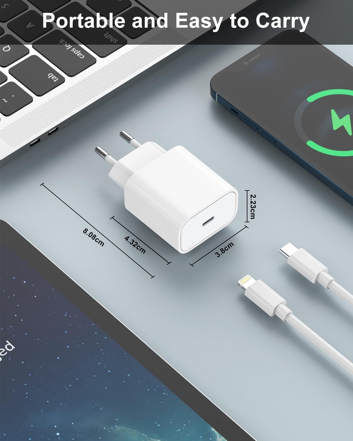 Dankzij het compacte en lichtgewicht ontwerp is deze 20W USB-C adapter gemakkelijk mee te nemen, of je nu thuis, op kantoor of onderweg bent. Door de korte oplaadtijd kun je jouw iPhone snel weer gebruiken, zodat je altijd verbonden blijft.