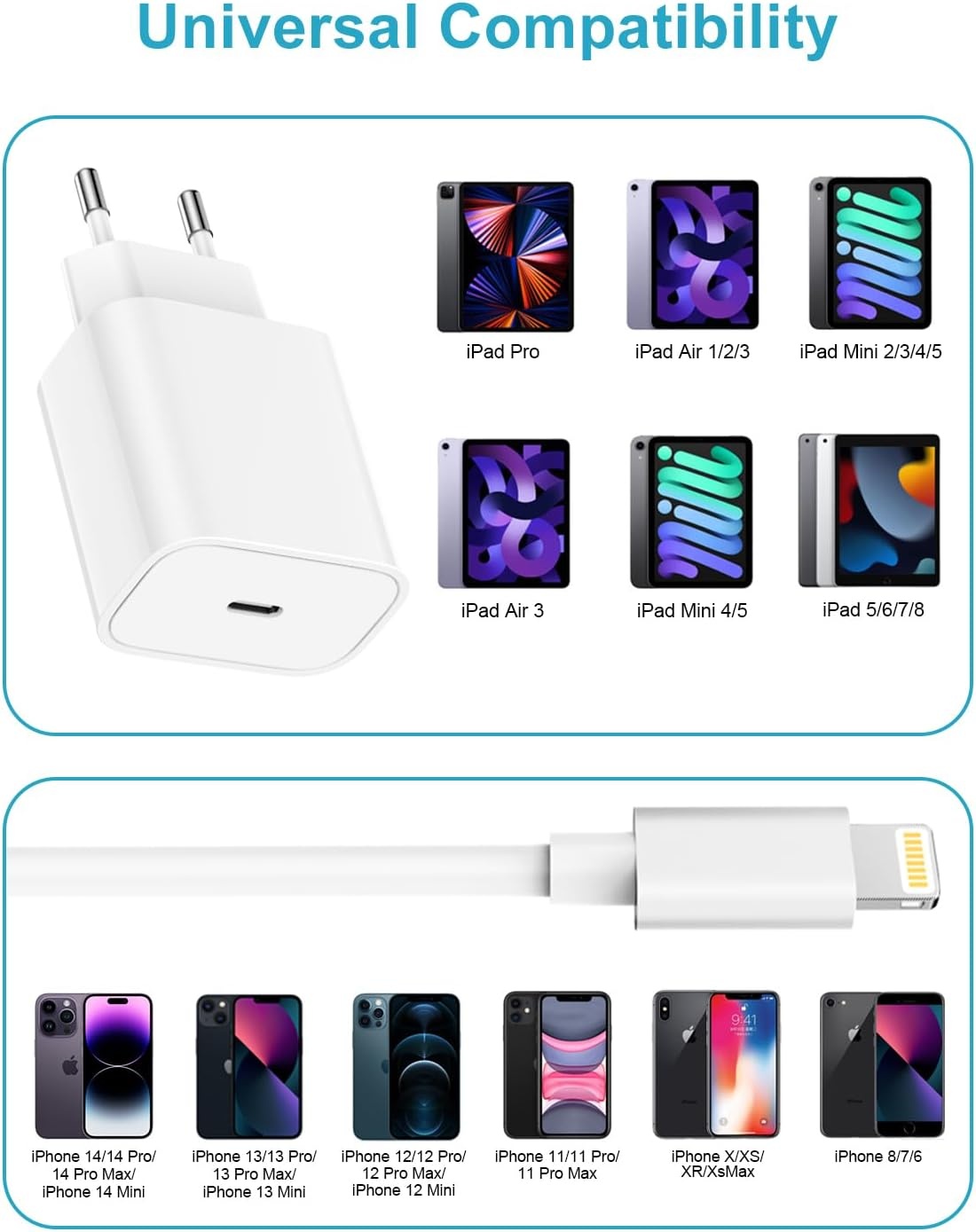 Deze 20W USB-C oplader is speciaal ontworpen voor de nieuwste -modellen. Hij is compatibel met 14, 14 Pro, 14 Pro Max, 13, 13 Pro, 13 Pro Max, 12, 11, Xr, Xs Max, 8, en 8 Plus. Of je nu een recente iPhone hebt of een iets ouder model, deze oplader voorziet elk apparaat van de juiste hoeveelheid stroom voor veilig en efficiënt opladen.