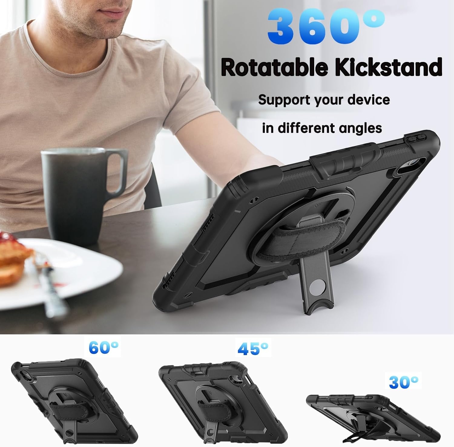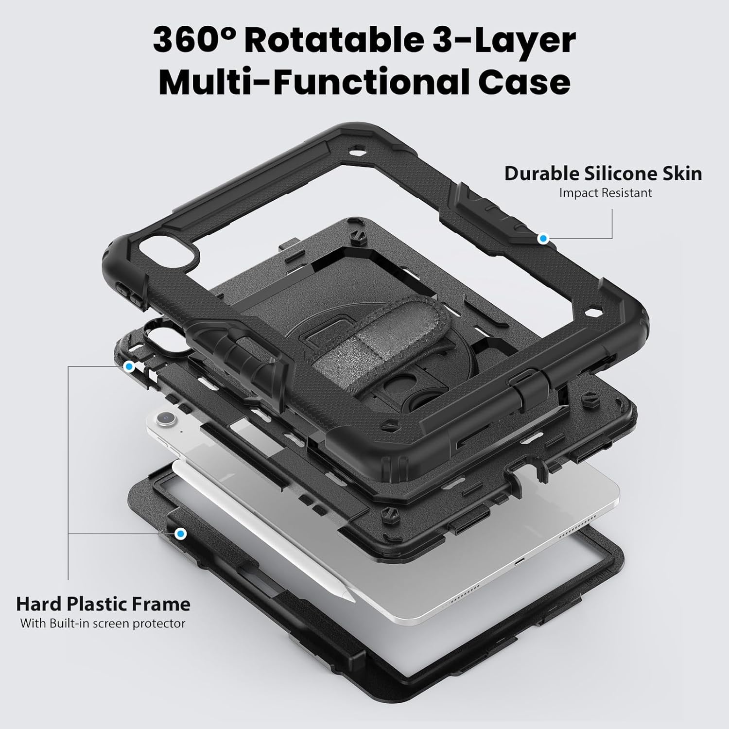 Hoes met ingebouwde Screenprotector Geschikt voor iPad Air 11 Inch Case 7th Generation M3 2025 hoes en iPad Air 7th/6th/5th/4th Gen (11/10.9 Inch, 2025/2024) Extreme Armor met Schouderiem, Handriem en Pencilhouder hoes - voor Horeca en Bouw - Zwart