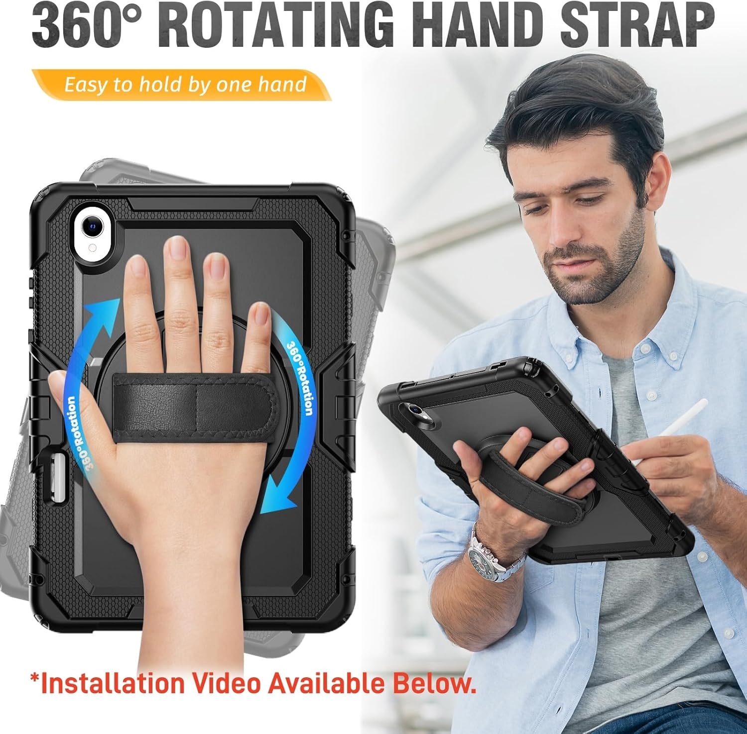 - 360 graden rotatie: Door middel van het leren handvat, kun je de iPad gemakkelijk 360 graden draaien