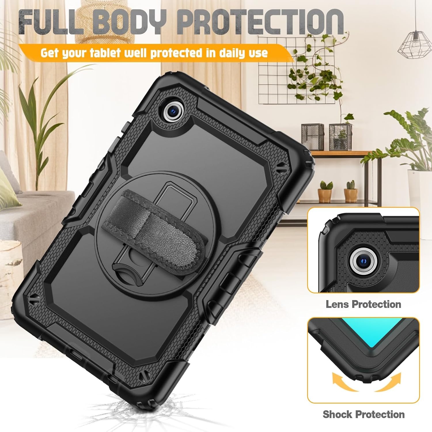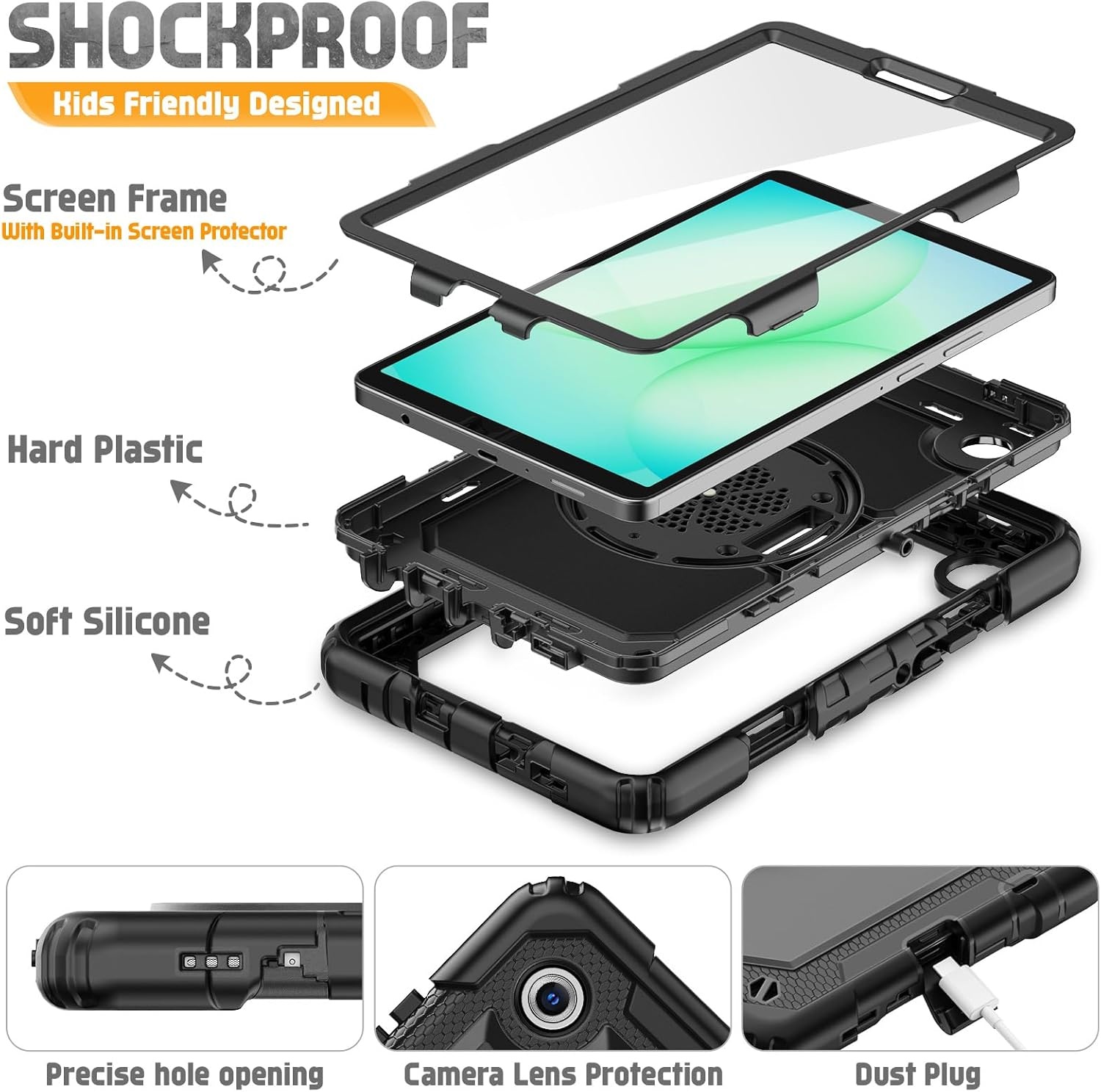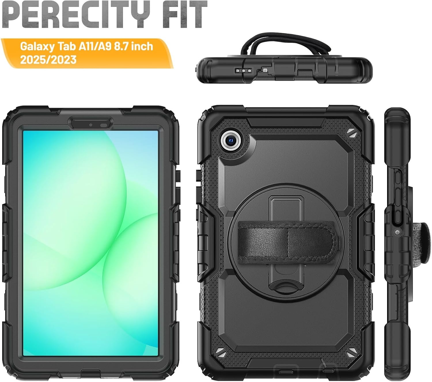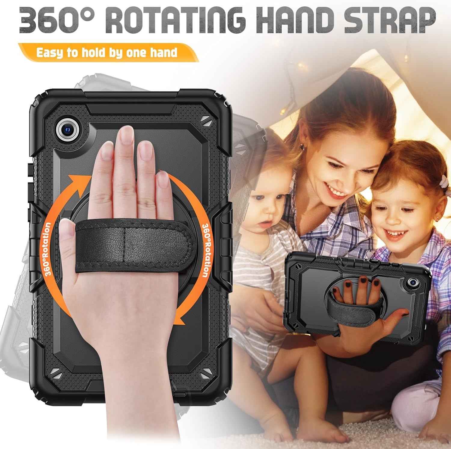 De extreme armor hoes met schouderriem, handriem, screenprotector en pencil houder is ontworpen om perfect te passen bij de Samsung Galaxy Tab A11 8.7 inch en Samsung A9 8.7 inch en biedt volledige toegang tot alle poorten, knoppen en de camera. Het is gemaakt van duurzame materialen en heeft een anti-shock laag die schokken opvangt en de impact op de Tab vermindert. De hoes heeft ook versterkte hoeken die extra bescherming bieden bij het vallen.