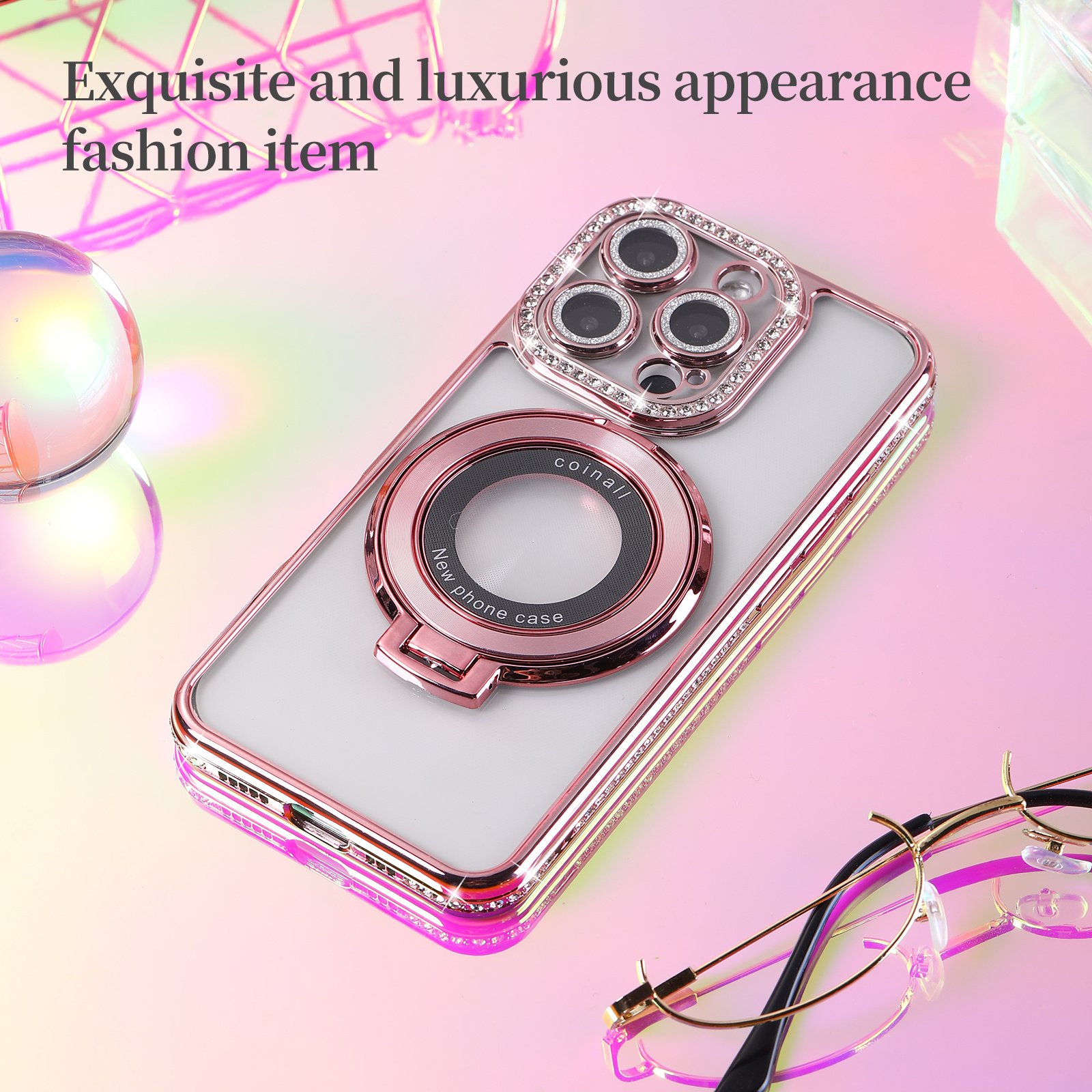 Hoesje Geschikt voor iPhone 15 Pro Max Magsafe hoesje Rose Goud - Lens beschermer ring Luxury Bling Sparkly Diamond backcover