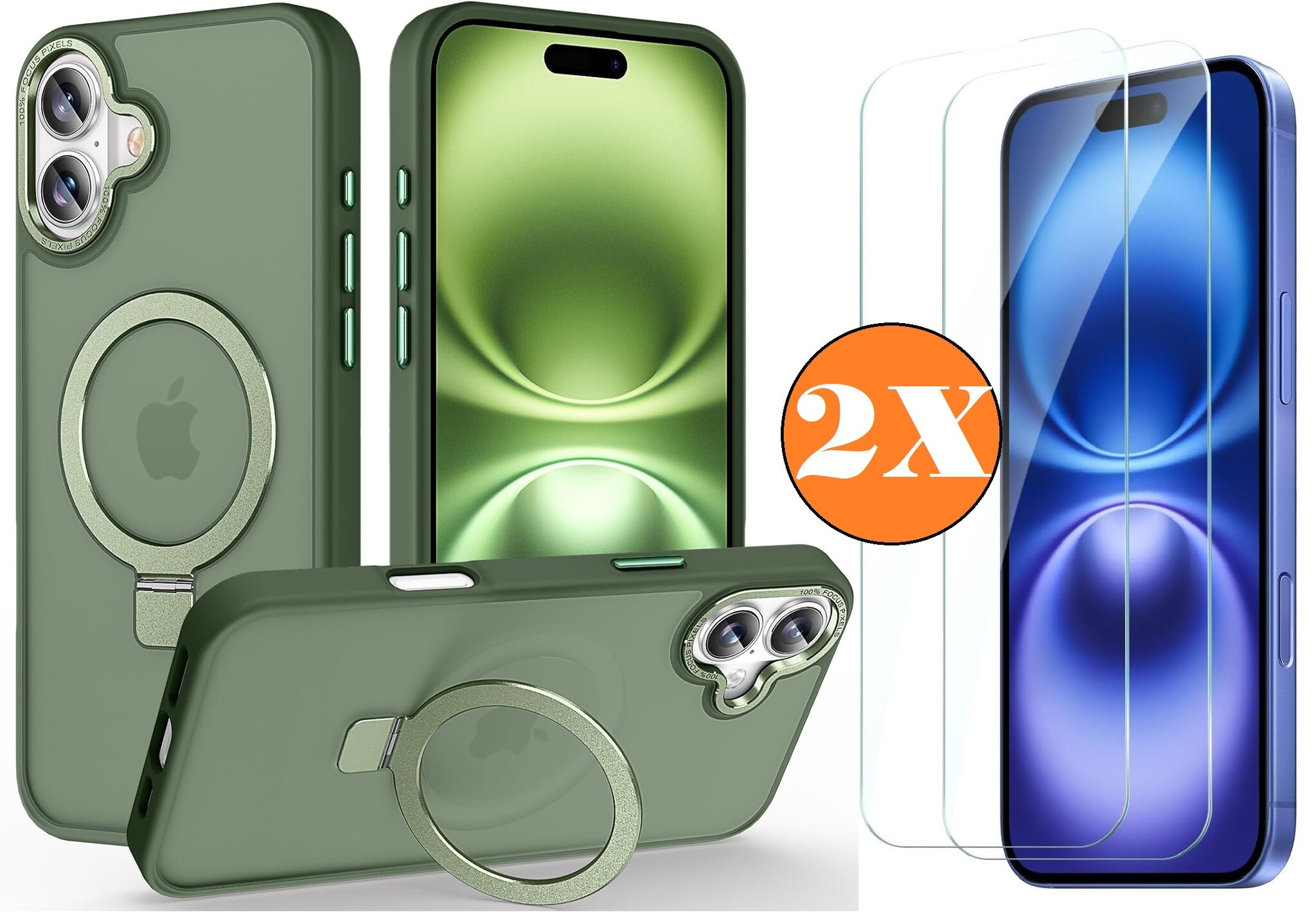 Hoesje Geschikt voor iPhone 16 MagSafe Hoesje met Ring Stand Groen - Hoesje MagSafe iPhone 16 Screenprotector Gehard Glas 2X