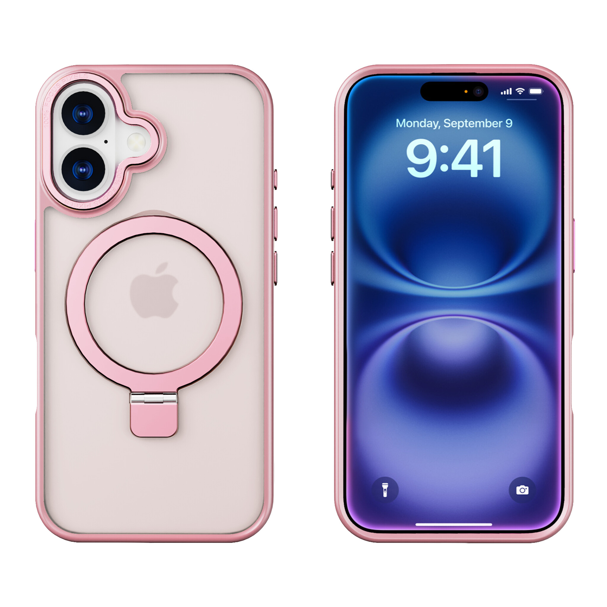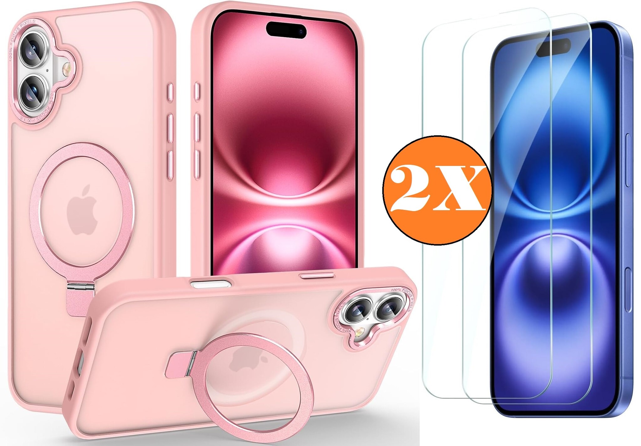 Hoesje Geschikt voor iPhone 16 Plus MagSafe Hoesje met Ring Stand Rose Goud - Hoesje MagSafe iPhone 16 Plus Screenprotector Gehard Glas 2X