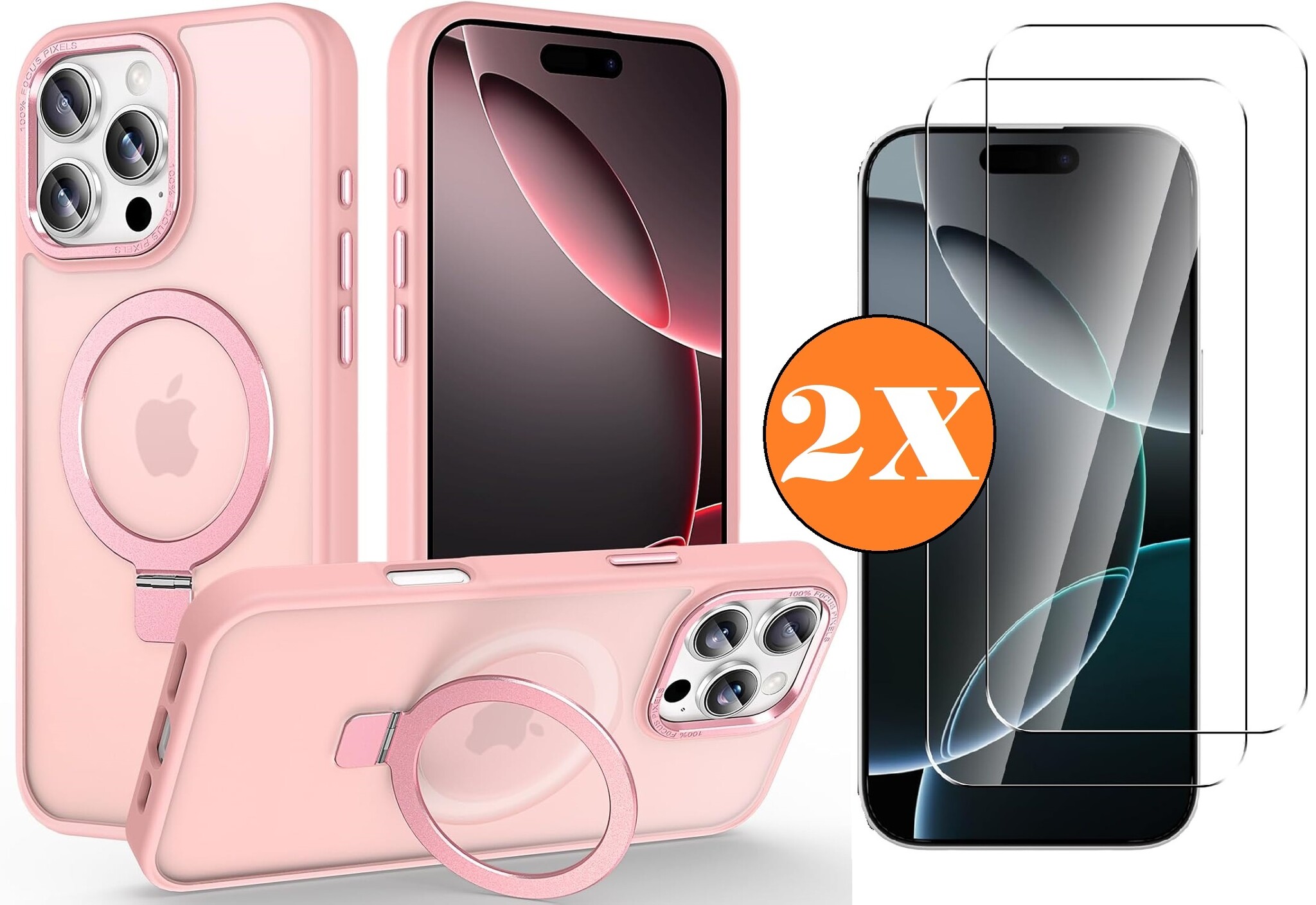 Hoesje Geschikt voor iPhone 16 Pro MagSafe Hoesje met Ring Stand Rose Goud - Hoesje MagSafe iPhone 16 Pro Screenprotector Gehard Glas 2X