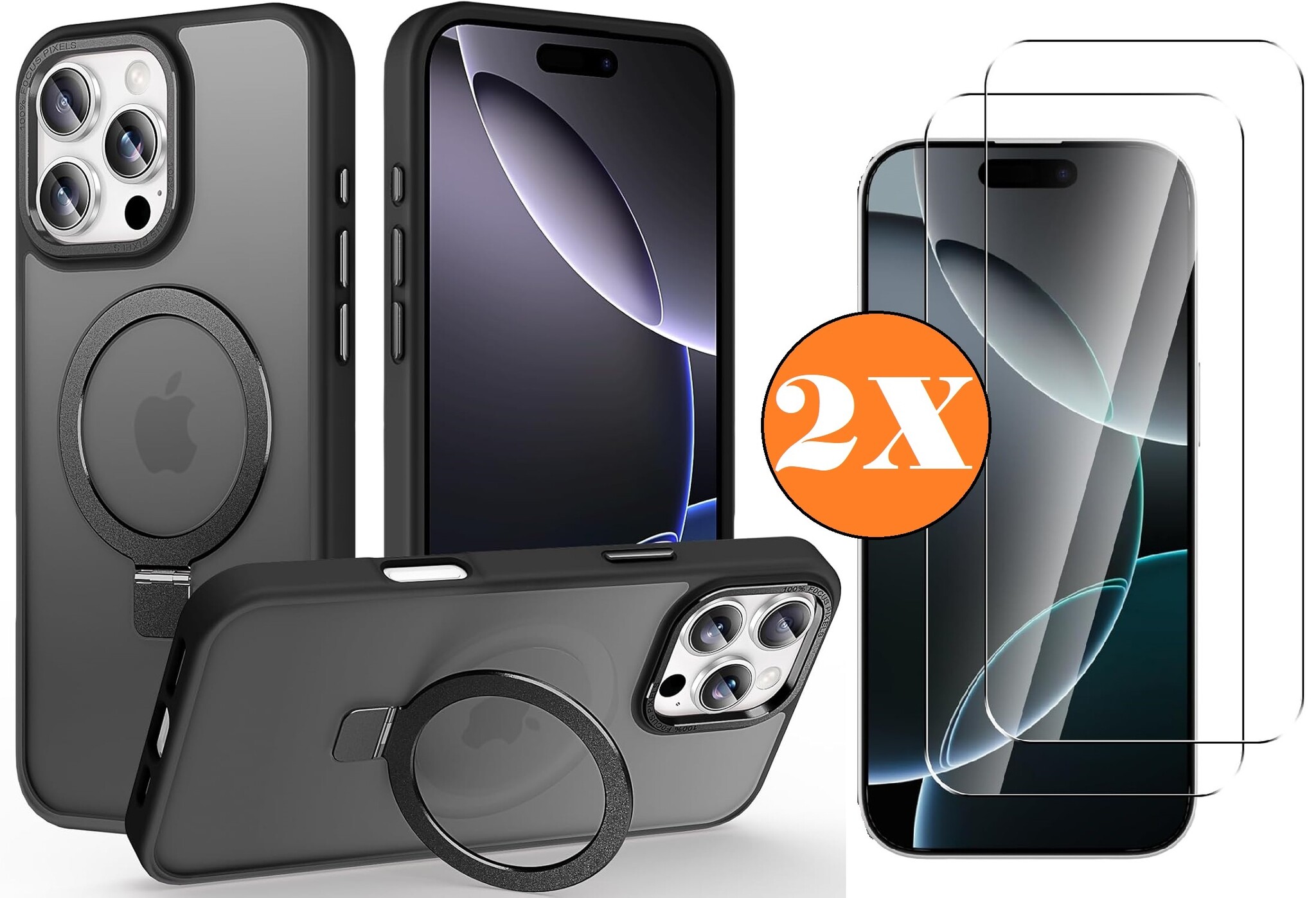Hoesje Geschikt voor iPhone 16 Pro Max MagSafe Hoesje met Ring Stand Zwart - Hoesje MagSafe iPhone 16 Pro Max Screenprotector Gehard Glas 2X
