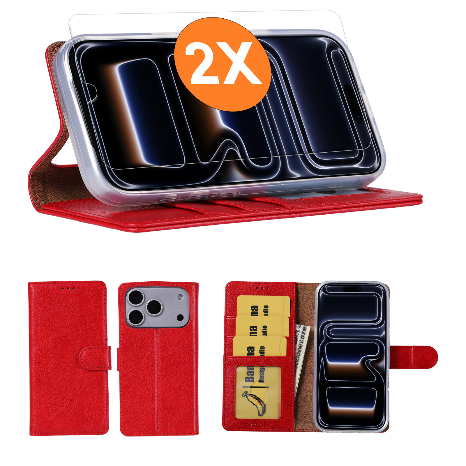 Hoesje geschikt voor iPhone 17 Pro hoesje Rood pasjeshouder telefoon hoes - Met screenprotector tempered glass voor iPhone 17 Pro - 2x