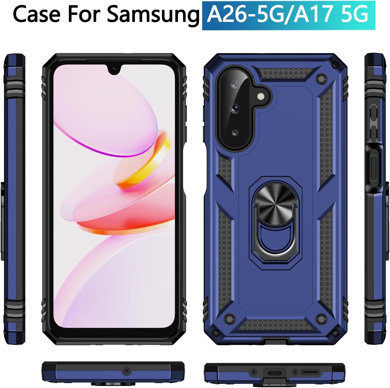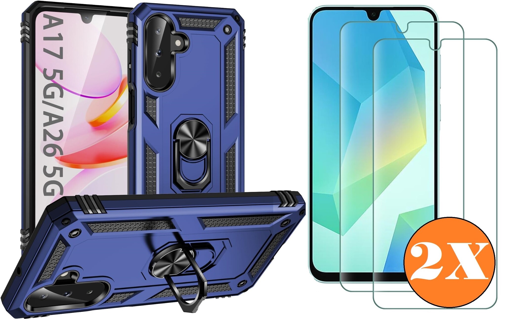 Hoesje Geschikt voor Samsung Galaxy A17 5G / A26 5G Hoesje Blauw Anti-Shock Hybrid Armor hoesje Met Draaibare Ring Houder - Samsung A17 Screenprotector 2 pack