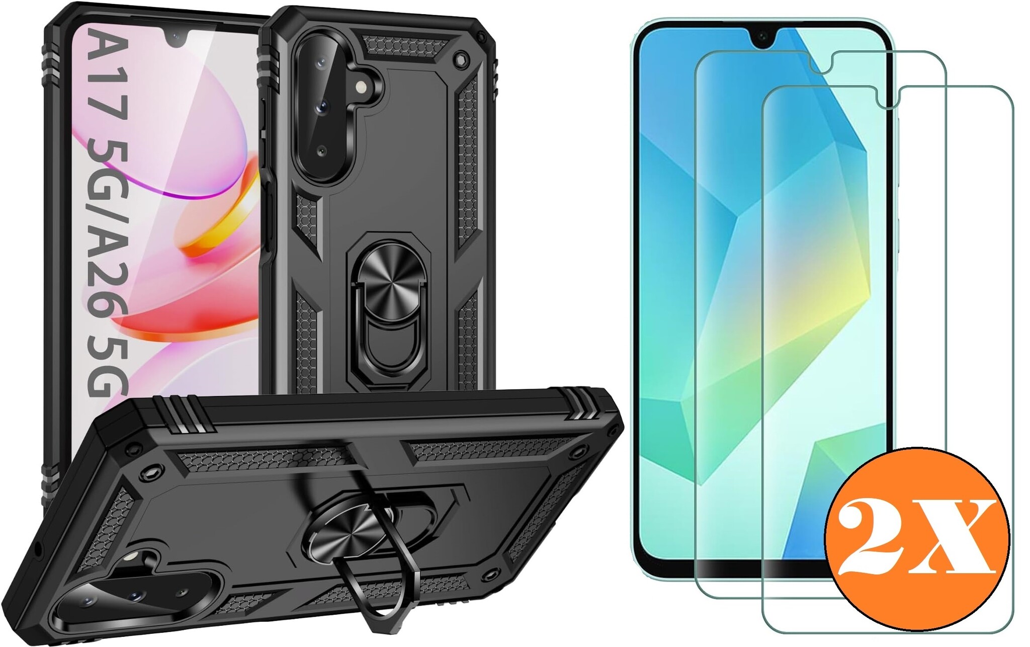 Hoesje Geschikt voor Samsung Galaxy A17 5G / A26 5G Hoesje Zwart Anti-Shock Hybrid Armor hoesje Met Draaibare Ring Houder - Samsung A17 Screenprotector 2 pack