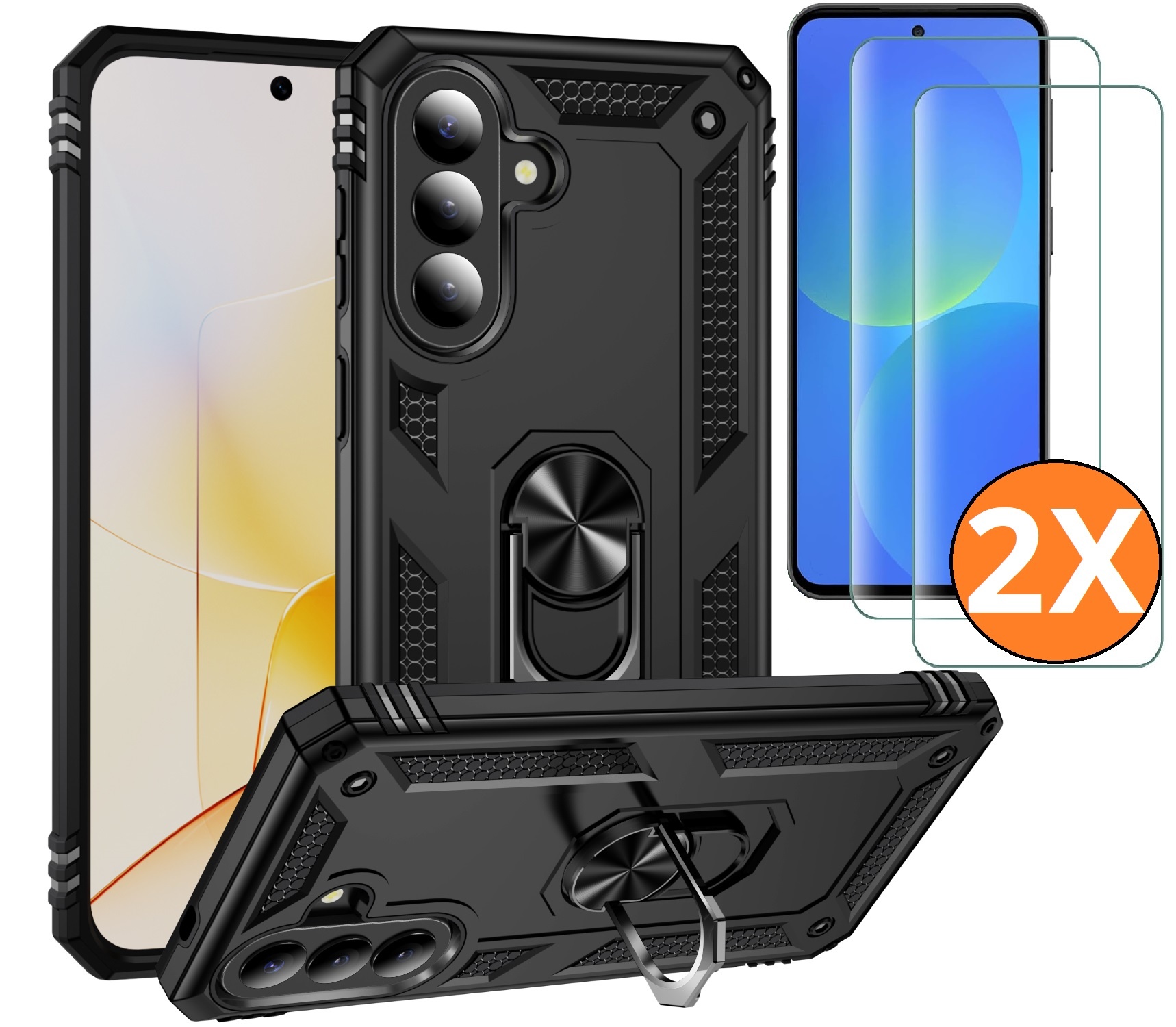 Hoesje Geschikt voor Samsung Galaxy A37 5G Hoesje Zwart Anti-Shock Hybrid Armor hoesje Met Draaibare Ring Houder - Samsung A37 Screenprotector 2 pack