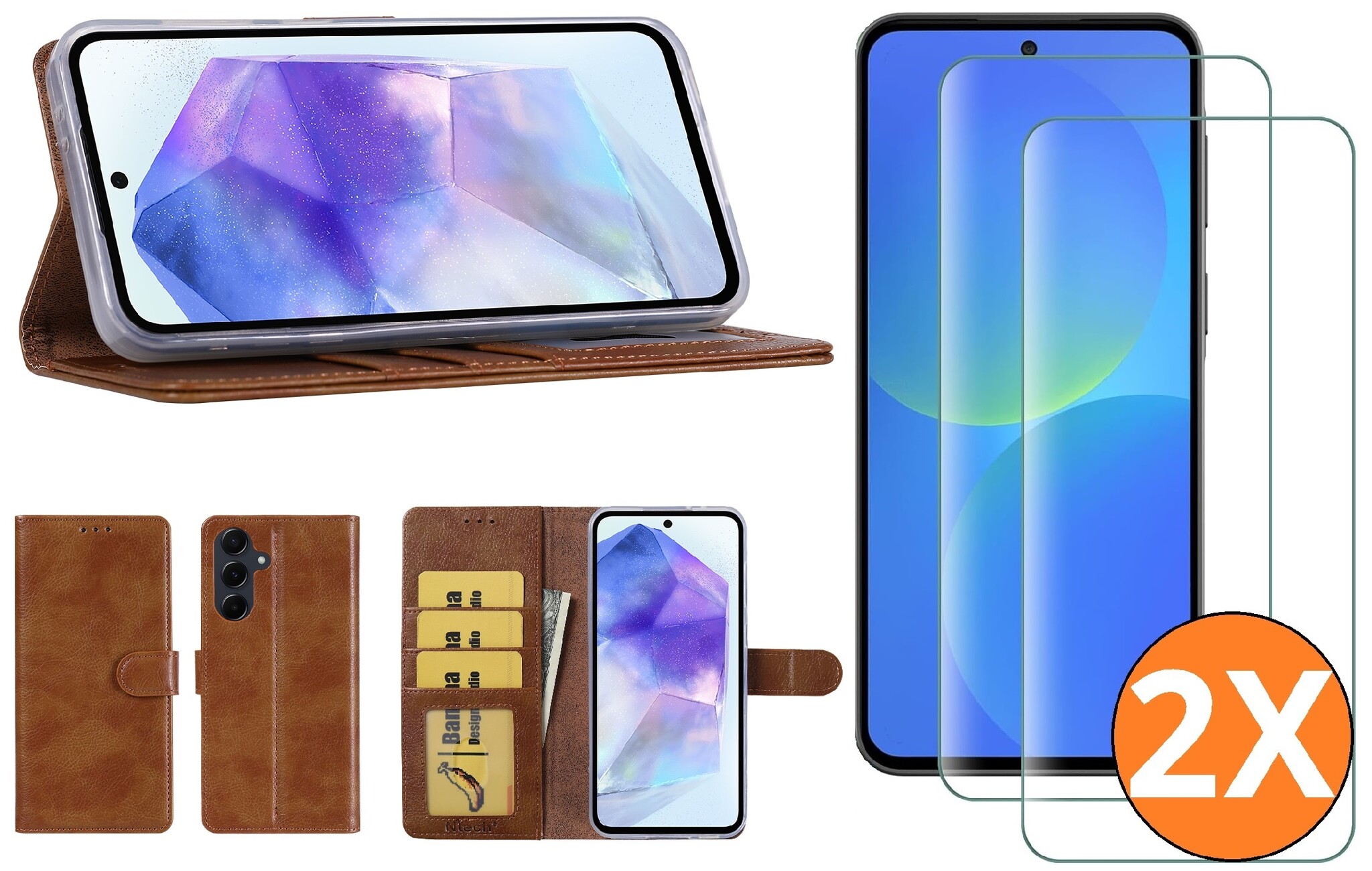 Hoesje geschikt voor Samsung Galaxy A37 5G hoesje Bruin pasjeshouder telefoon hoes - Met screenprotector tempered glass voor Galaxy A37 5G - 2x