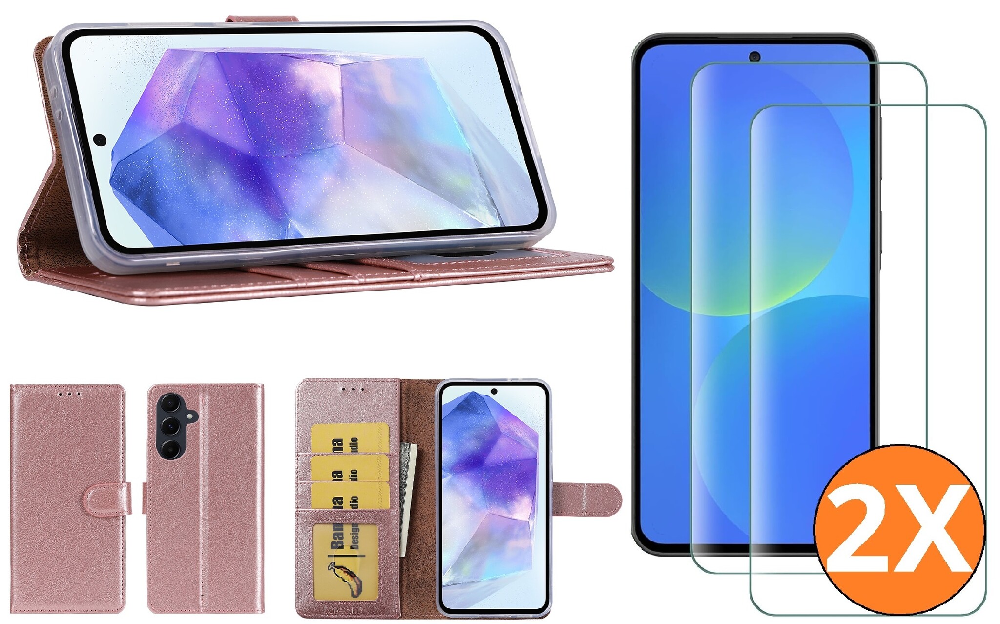Hoesje geschikt voor Samsung Galaxy A37 5G hoesje Rose Goud pasjeshouder telefoon hoes - Met screenprotector tempered glass voor Galaxy A37 5G - 2x