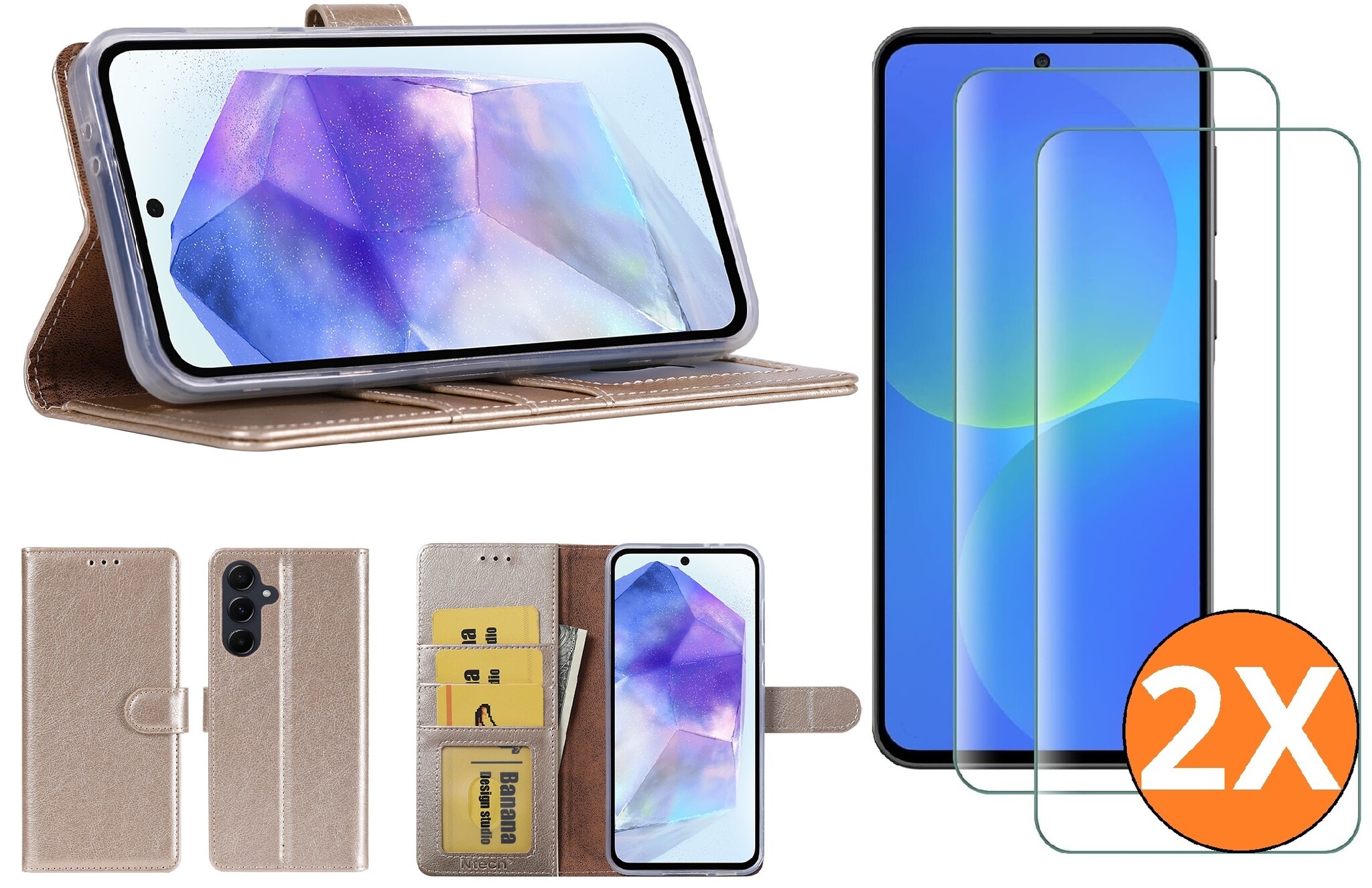 Hoesje geschikt voor Samsung Galaxy A37 5G hoesje Goud pasjeshouder telefoon hoes - Met screenprotector tempered glass voor Galaxy A37 5G - 2x