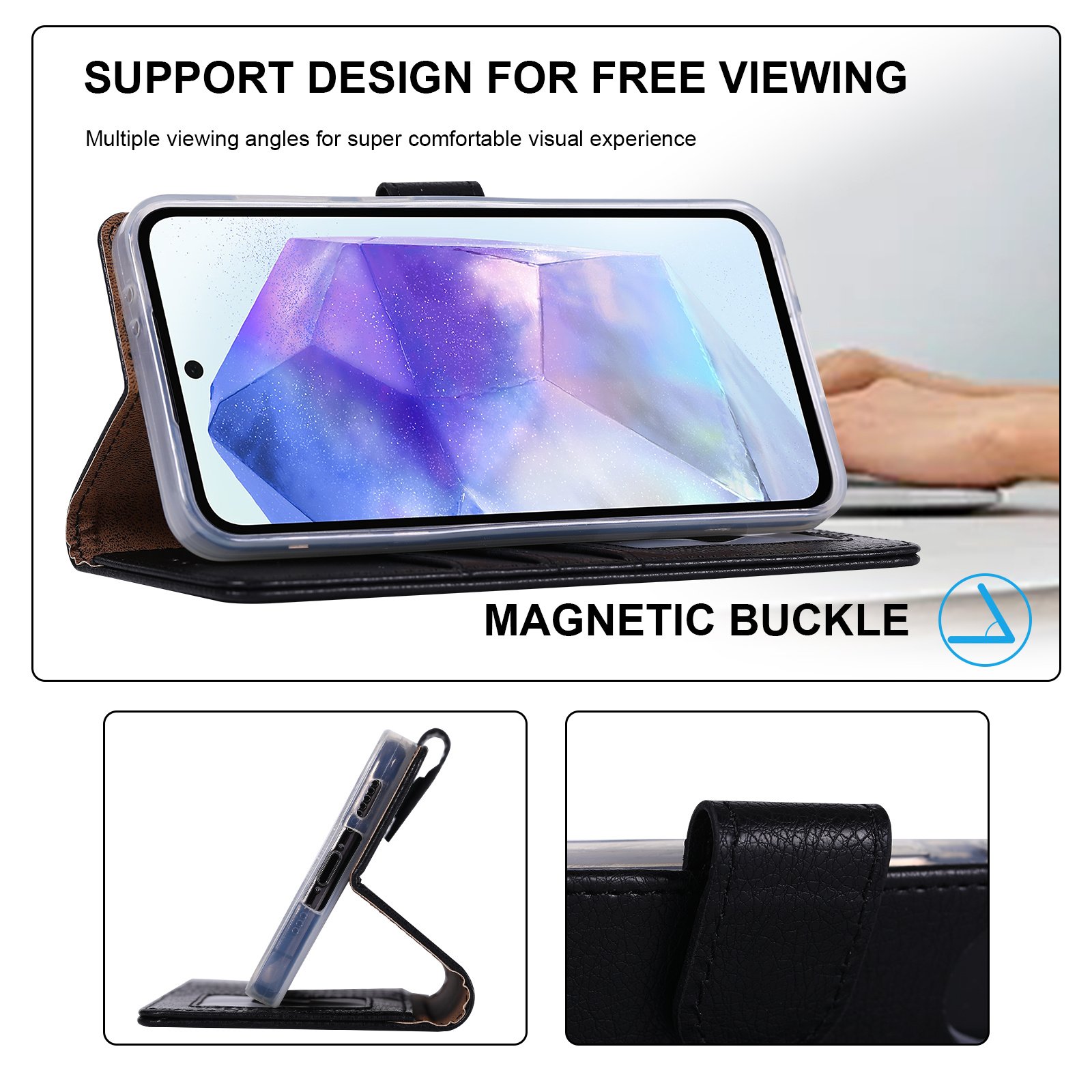 - Magnetische sluiting zorgt ervoor dat het hoesje goed gesloten blijft en je telefoon veilig opgeborgen is.