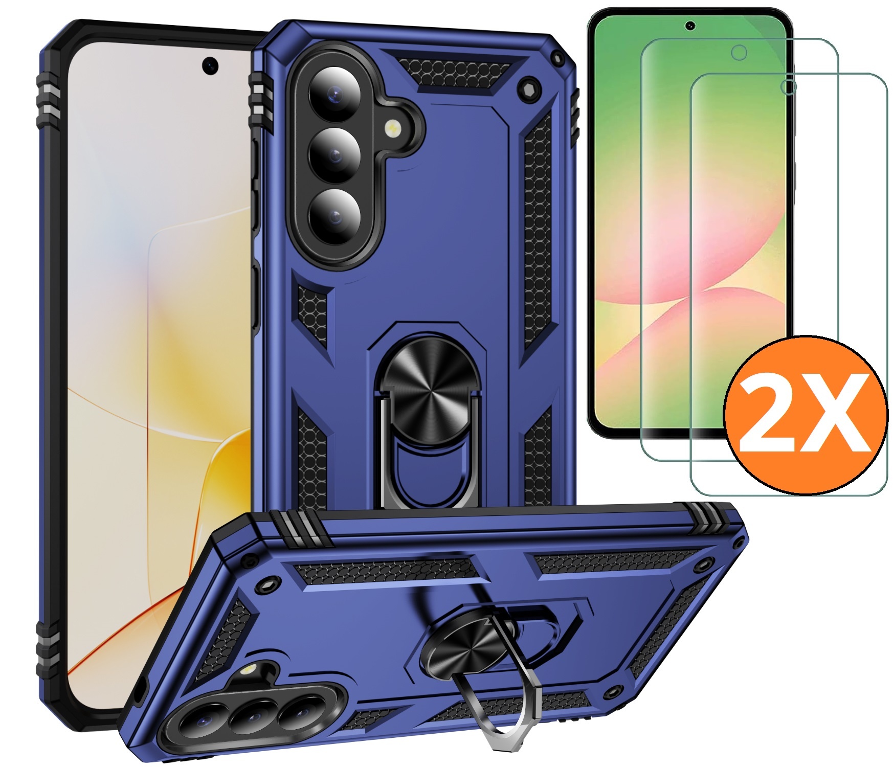 Hoesje Geschikt voor Samsung Galaxy A57 4G / 5G Hoesje Blauw Anti-Shock Hybrid Armor hoesje Met Draaibare Ring Houder - Samsung A57 Screenprotector 2 pack