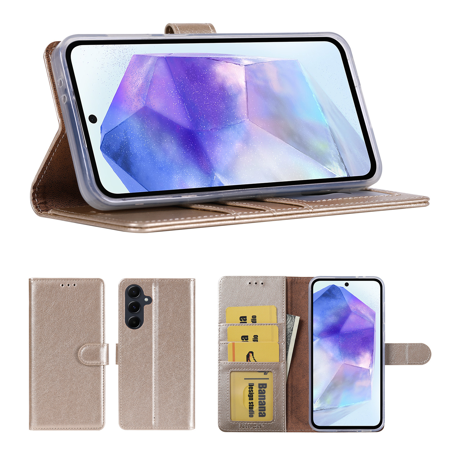 Hoesje geschikt voor Samsung Galaxy A57 5G hoesje Goud pasjeshouder telefoon hoes - Met screenprotector tempered glass voor Galaxy A57 5G - 2x