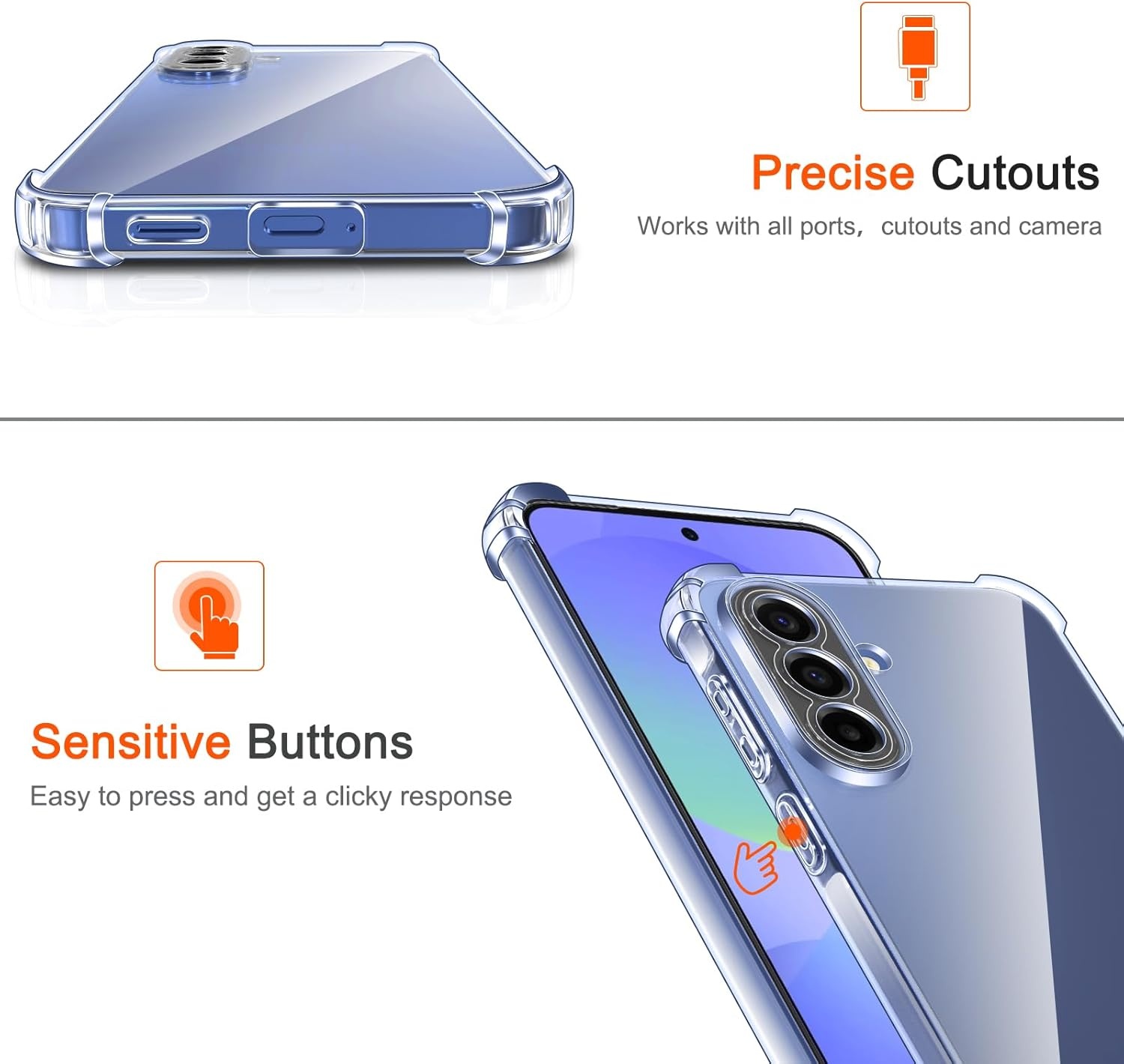 - Transparant siliconen hoesje dat schokken en stoten absorbeert, zodat je telefoon veilig is tegen onverwachte ongelukken.