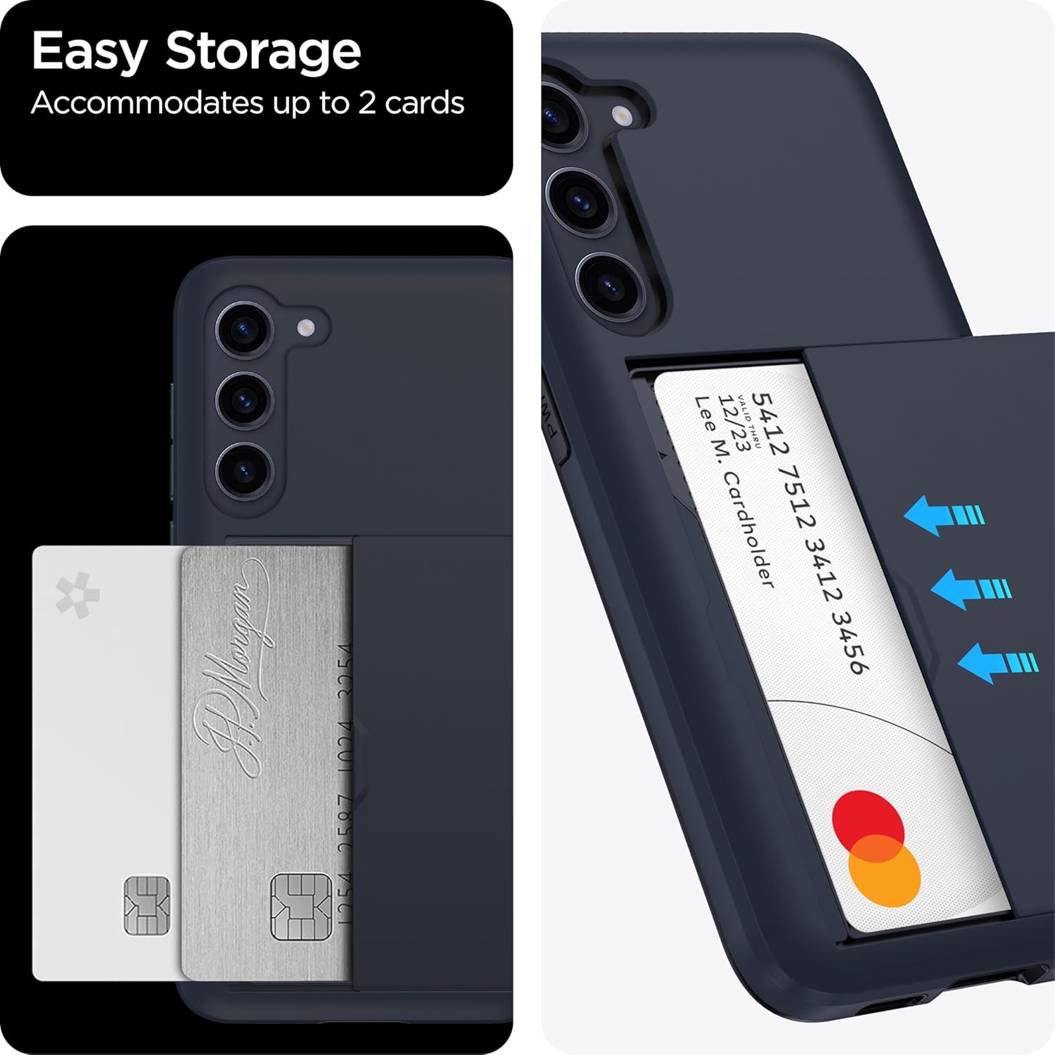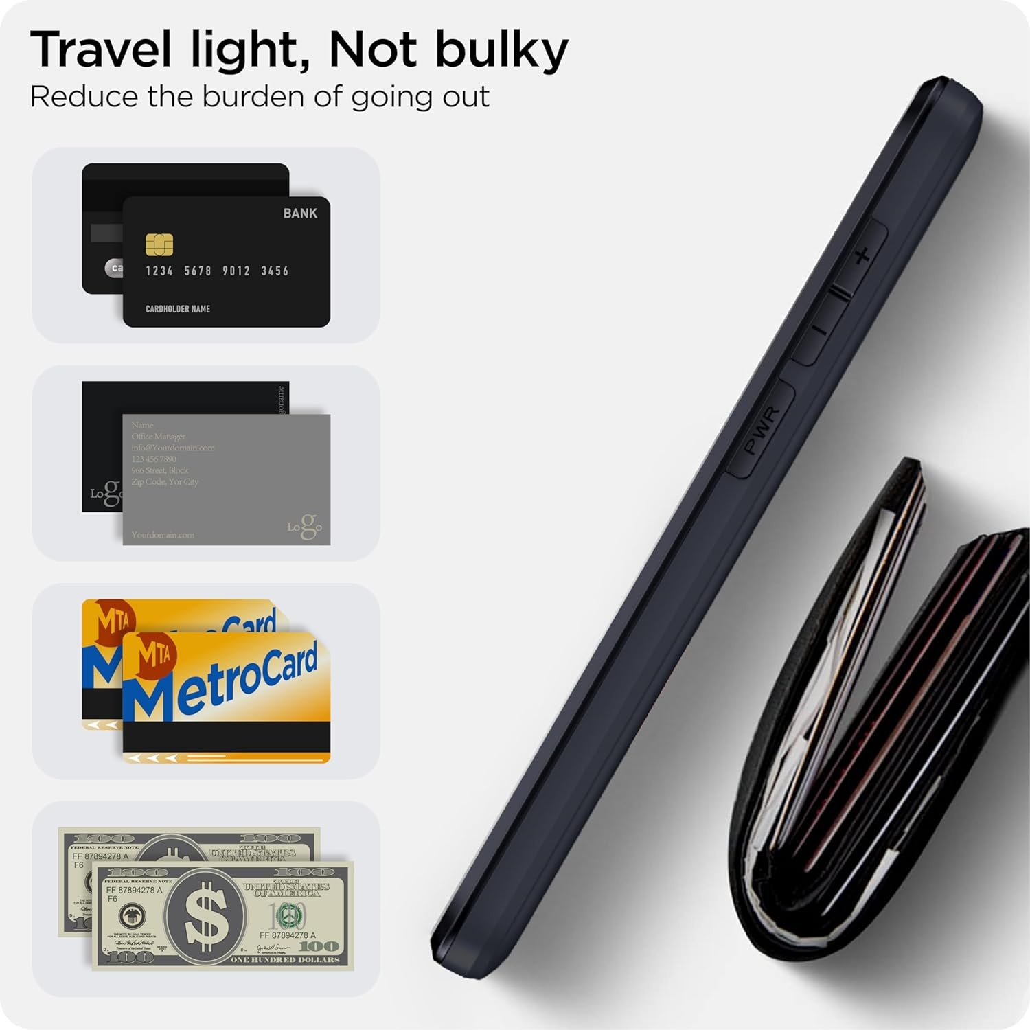Verborgen kaartsleuf ontwerp: Slank je portemonnee af, berg maximaal 2 kaarten op, draag je ID en creditcard in plaats van je enorme portemonnee overal mee naartoe te slepen, met alle benodigdheden in één hand, je zult het geweldig vinden hoe handig het is. Je hoort een “klik” als je het deurtje in de volledig gesloten positie schuift, het schuifje blijft stevig op zijn plaats zitten en je hoeft je geen zorgen te maken dat je je kaart kwijtraakt.