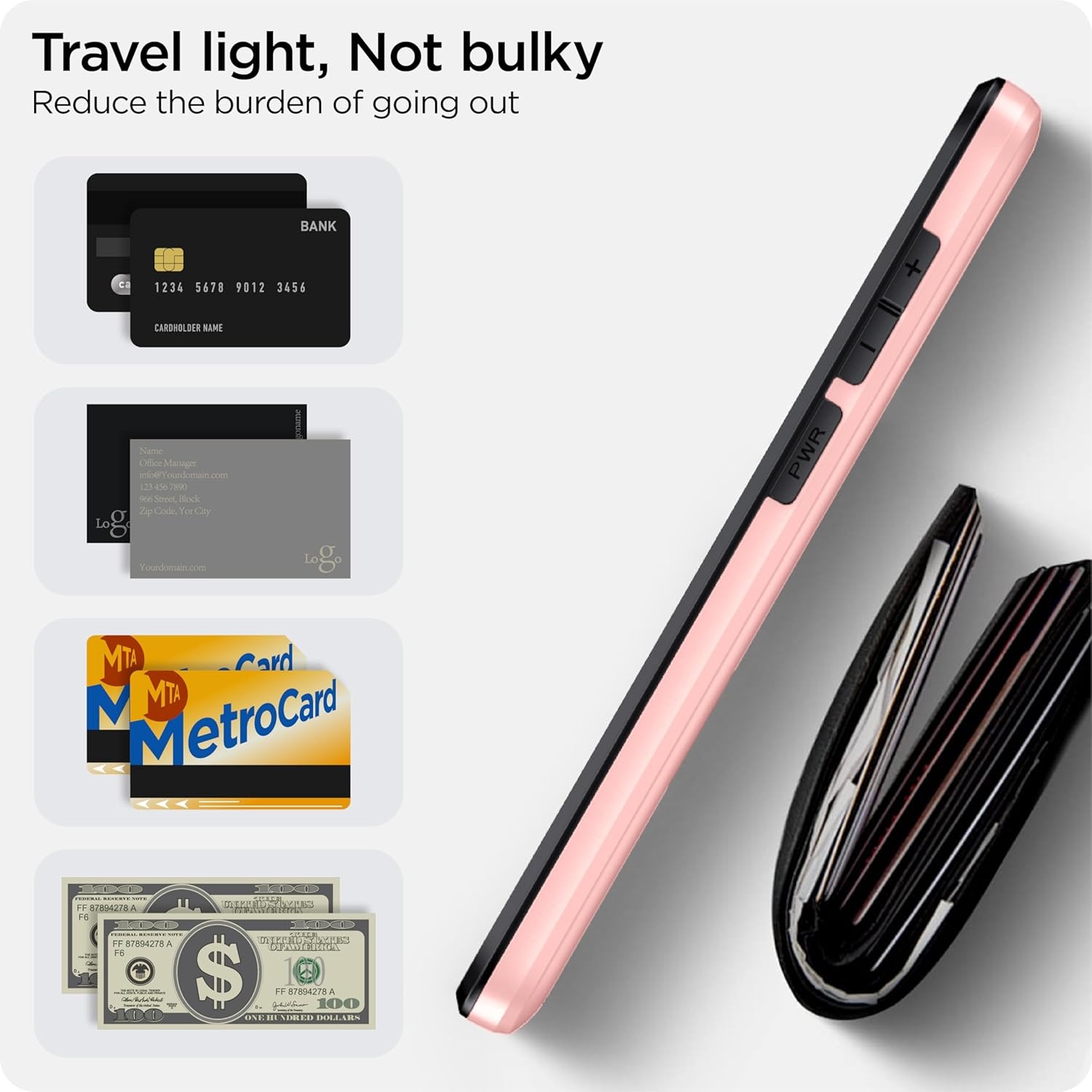 Verborgen kaartsleuf ontwerp: Slank je portemonnee af, berg maximaal 2 kaarten op, draag je ID en creditcard in plaats van je enorme portemonnee overal mee naartoe te slepen, met alle benodigdheden in één hand, je zult het geweldig vinden hoe handig het is. Je hoort een “klik” als je het deurtje in de volledig gesloten positie schuift, het schuifje blijft stevig op zijn plaats zitten en je hoeft je geen zorgen te maken dat je je kaart kwijtraakt.