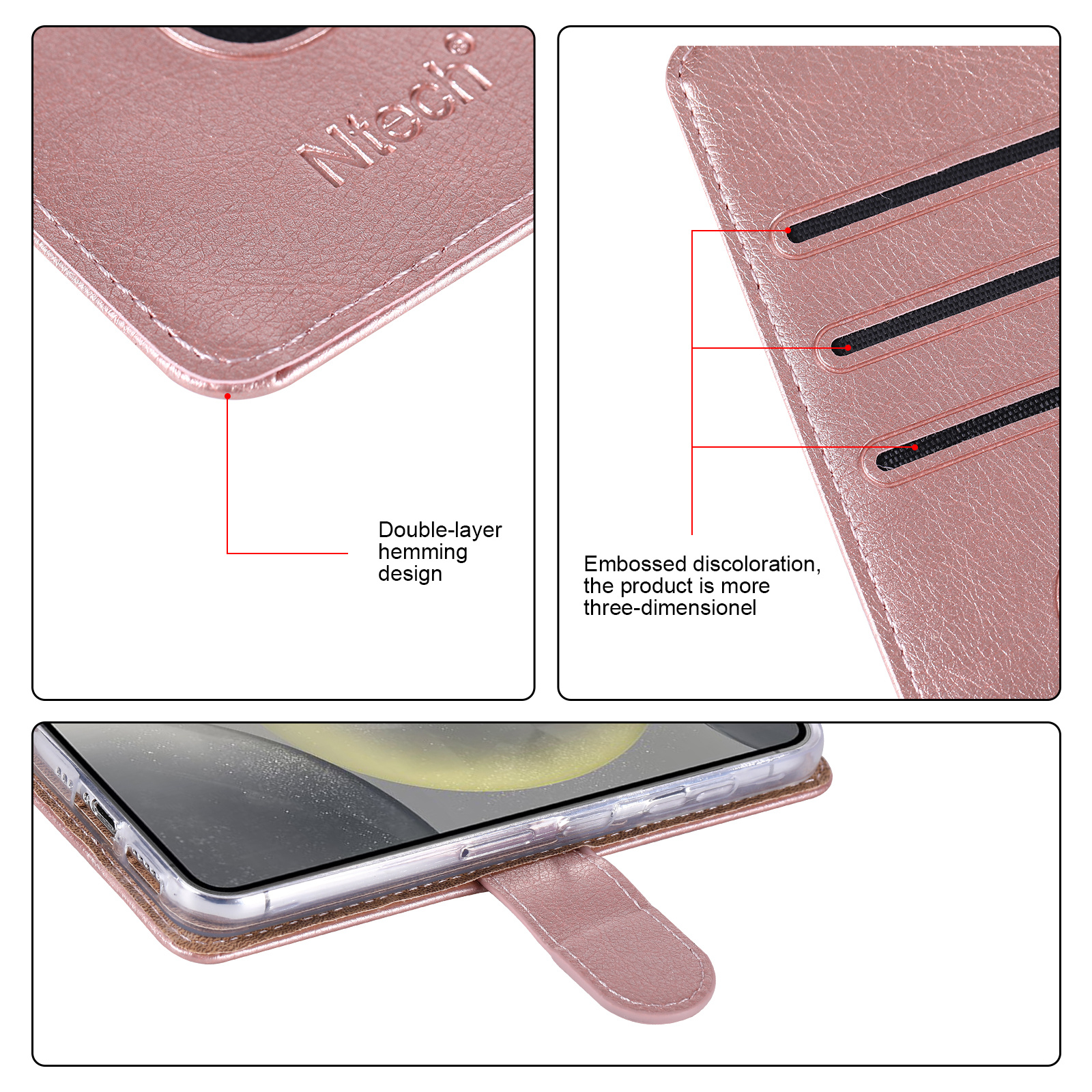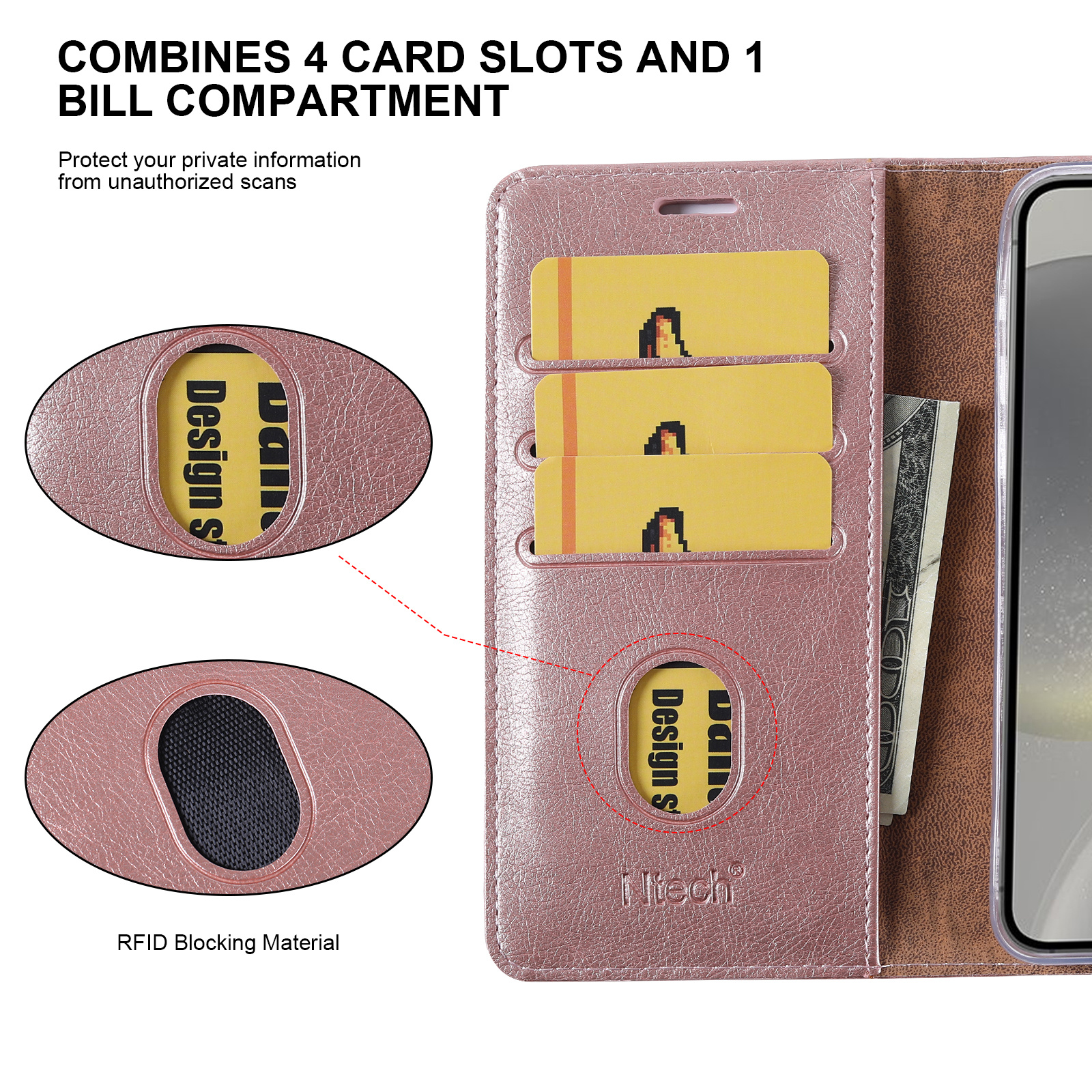 - Hoogwaardige Bookcase: Duurzaam materiaal met een elegante uitstraling, met vakken voor pasjes, ID’s en cash.