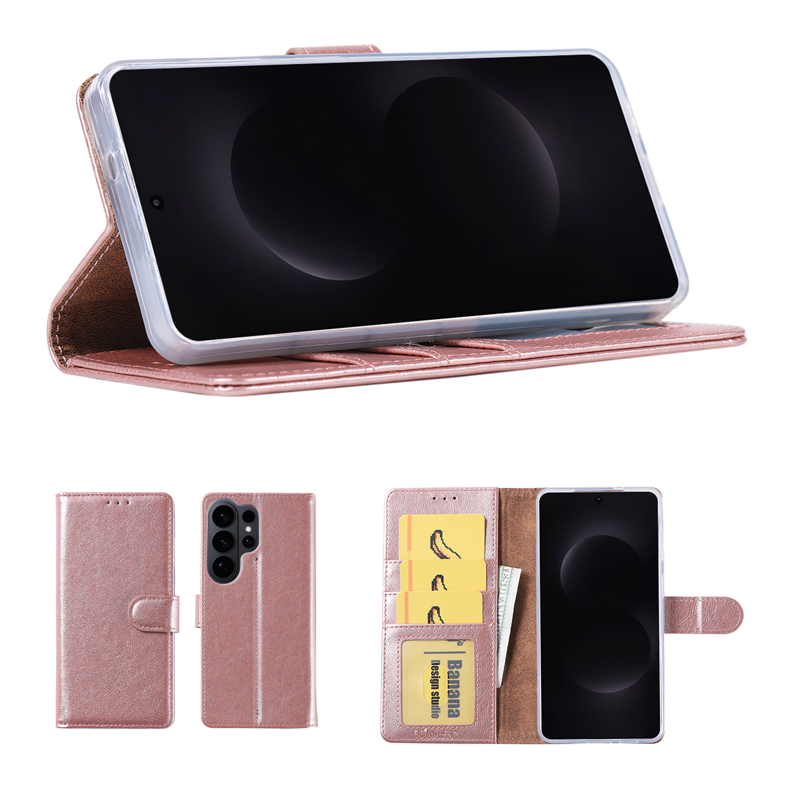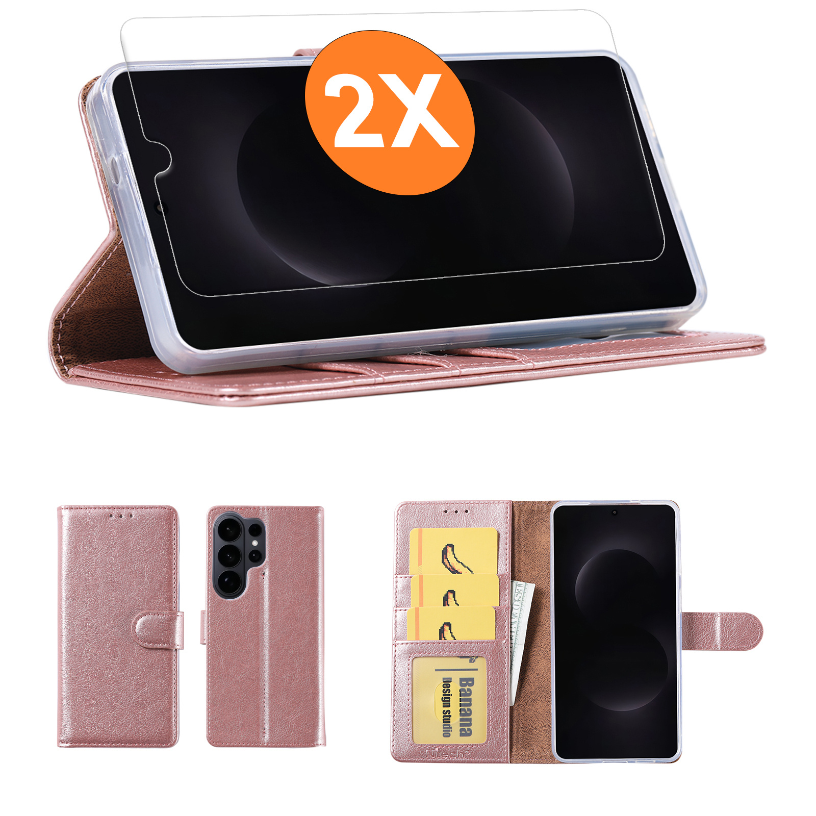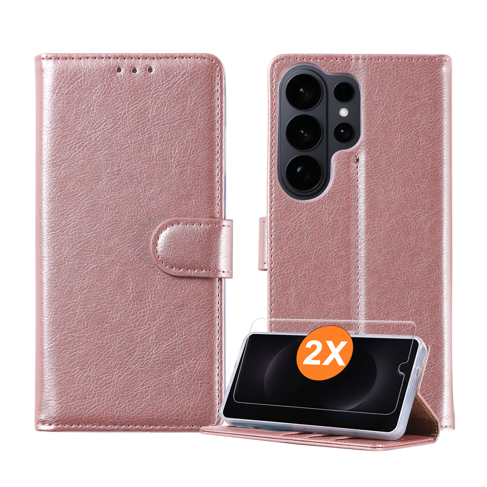 Hoesje geschikt voor Samsung Galaxy S26 Ultra 5G hoesje Rose Goud pasjeshouder telefoon hoes - Met screenprotector tempered glass voor Galaxy S26 Ultra 5G - 2x