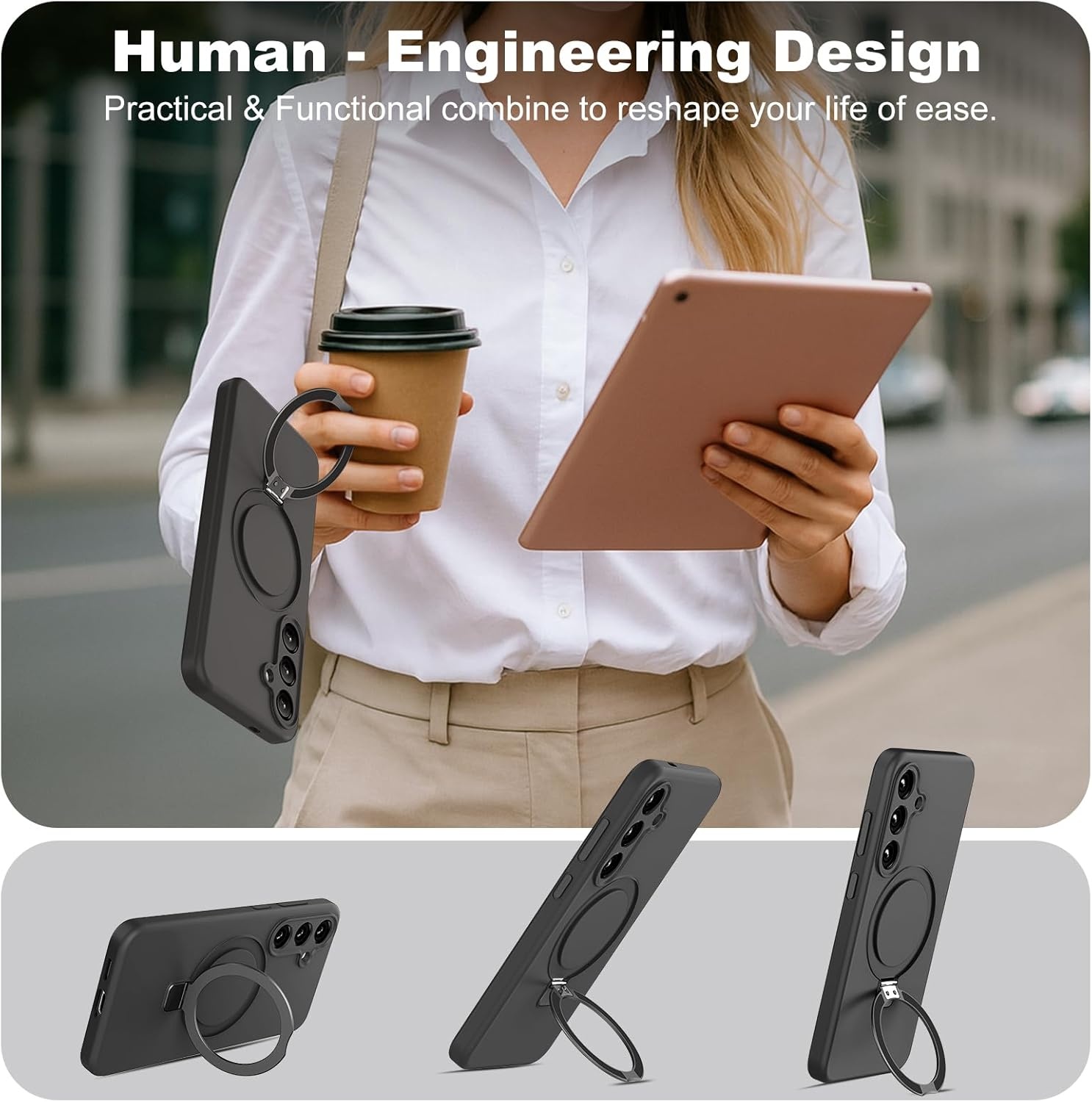 De geïntegreerde ringstandaard voegt extra gebruiksgemak toe. De ring is draaibaar en kan worden gebruikt als standaard in zowel verticale als horizontale positie. Ideaal voor videobellen, het bekijken van video’s, scrollen of handsfree gebruik. Wanneer de ring niet wordt gebruikt, klapt deze netjes plat tegen de hoes aan, waardoor het slanke design behouden blijft.