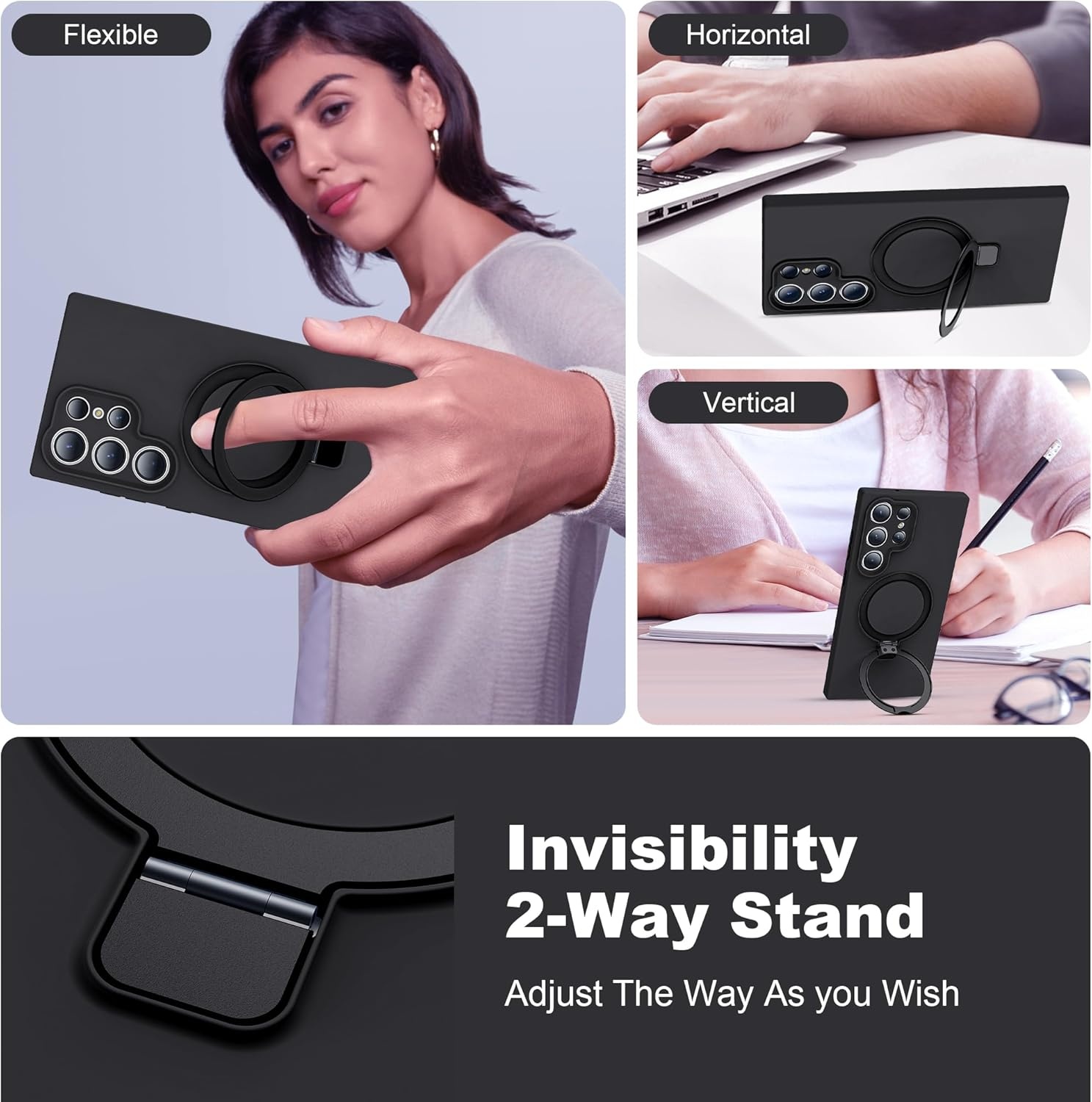 De geïntegreerde ringstandaard voegt extra gebruiksgemak toe. De ring is draaibaar en kan worden gebruikt als standaard in zowel verticale als horizontale positie. Ideaal voor videobellen, het bekijken van video’s, scrollen of handsfree gebruik. Wanneer de ring niet wordt gebruikt, klapt deze netjes plat tegen de hoes aan, waardoor het slanke design behouden blijft.