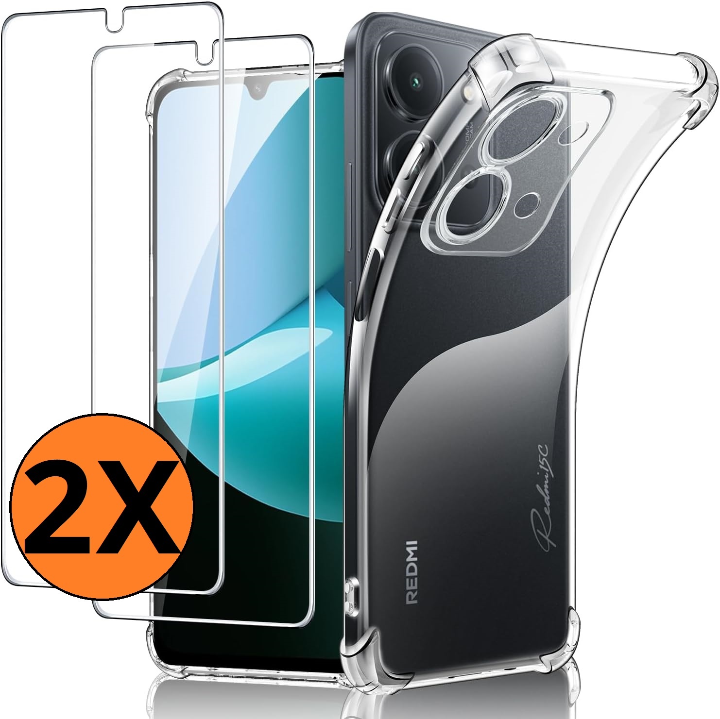 Hoesje Geschikt voor Xiaomi Redmi 15C 4G / 5G transparant hoesje Anti Shock silicone hoesje met 2 Pack Screenprotector tempered glass
