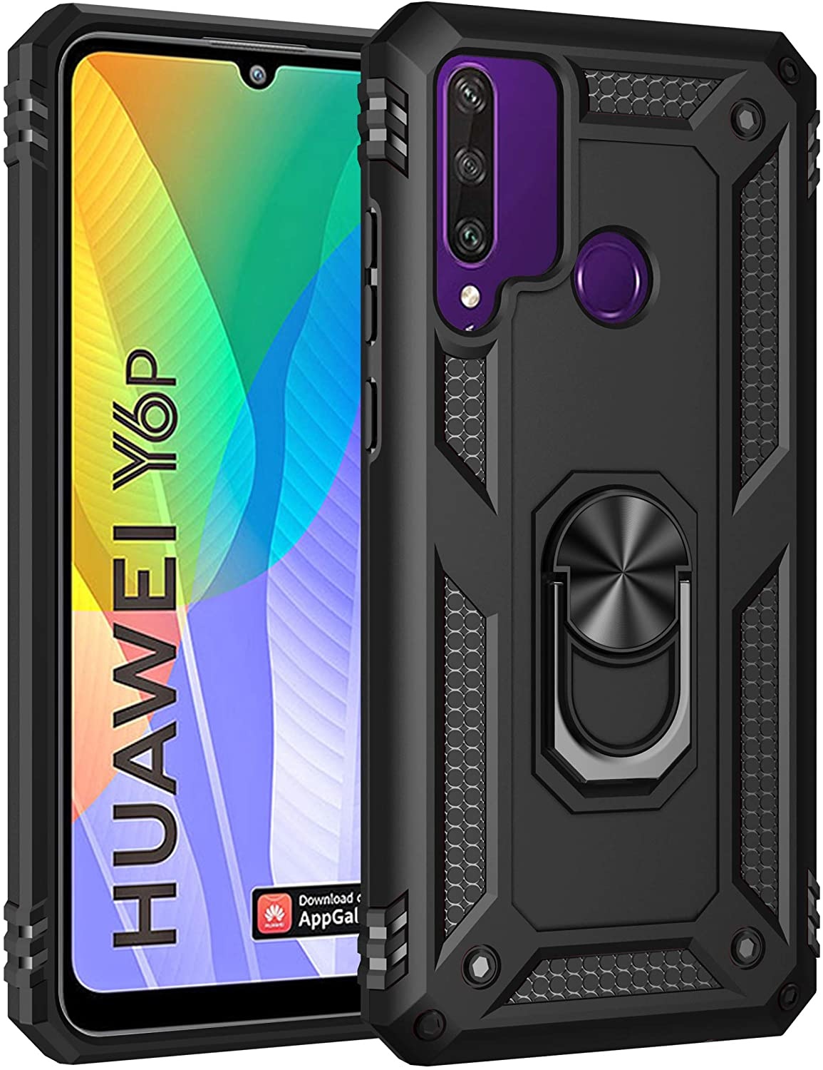 Hoesje Geschikt voor Huawei Y6p Hoesje - Anti-Shock Hybride Ring Armor met Kickstand - Zwart