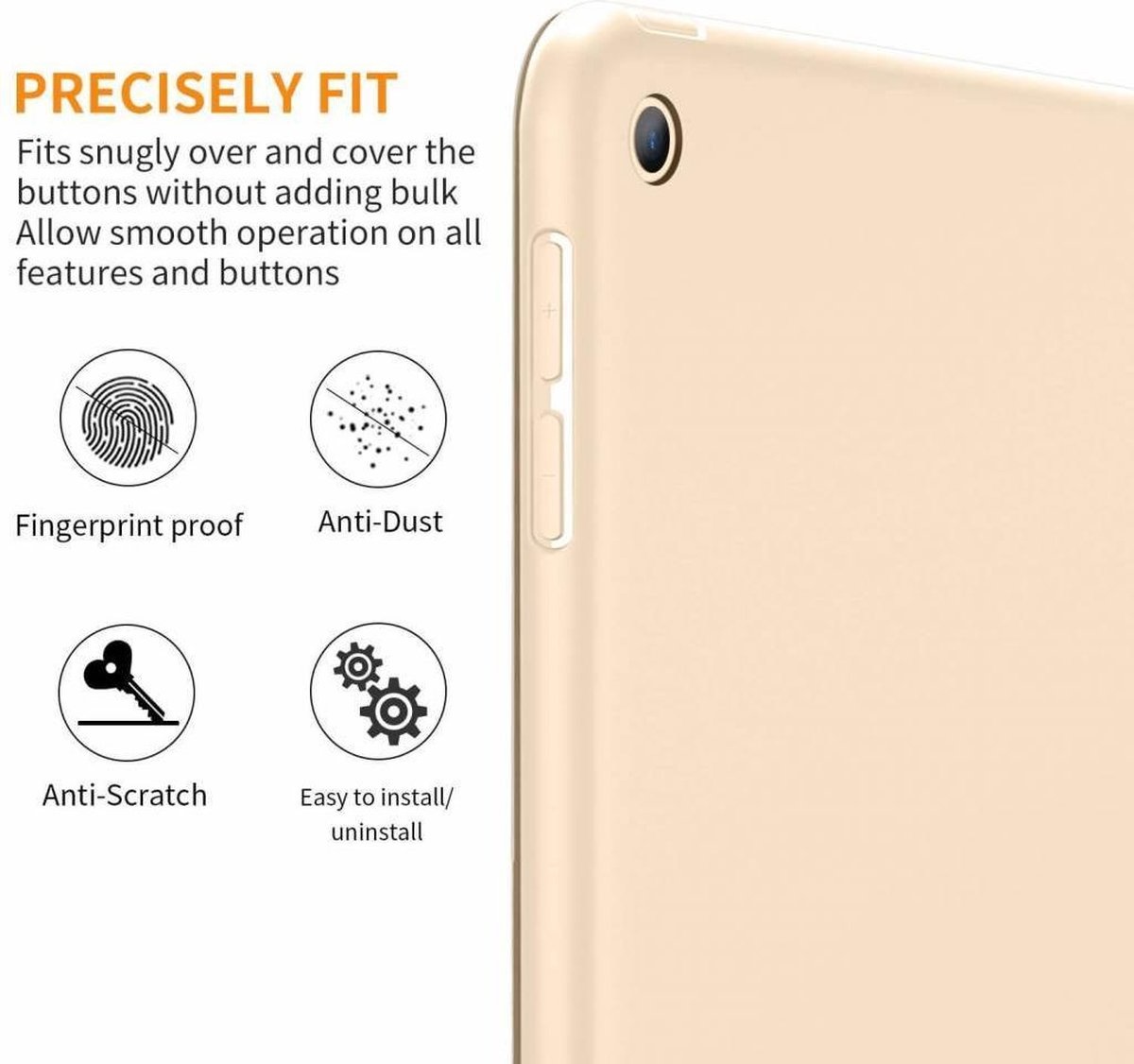 Ook zijn onze iPad 10.2 Smart covers uitgerust met een stand-by systeem, wanneer u de iPad 10.2 Smart cover sluit, zal de iPad doormiddel van een magneet systeem automatisch in stand-by modus gaan. Ook is er rekening gehouden met de bediening van de knoppen, deze zijn beschermd maar kunnen nog makkelijk bediend worden. Ook zitten er uitsparingen in deze iPad 10.2 Inch Smart Cover Case Goud zodat de camera, laadconnector, en speakers van uw iPad toegankelijk zijn.