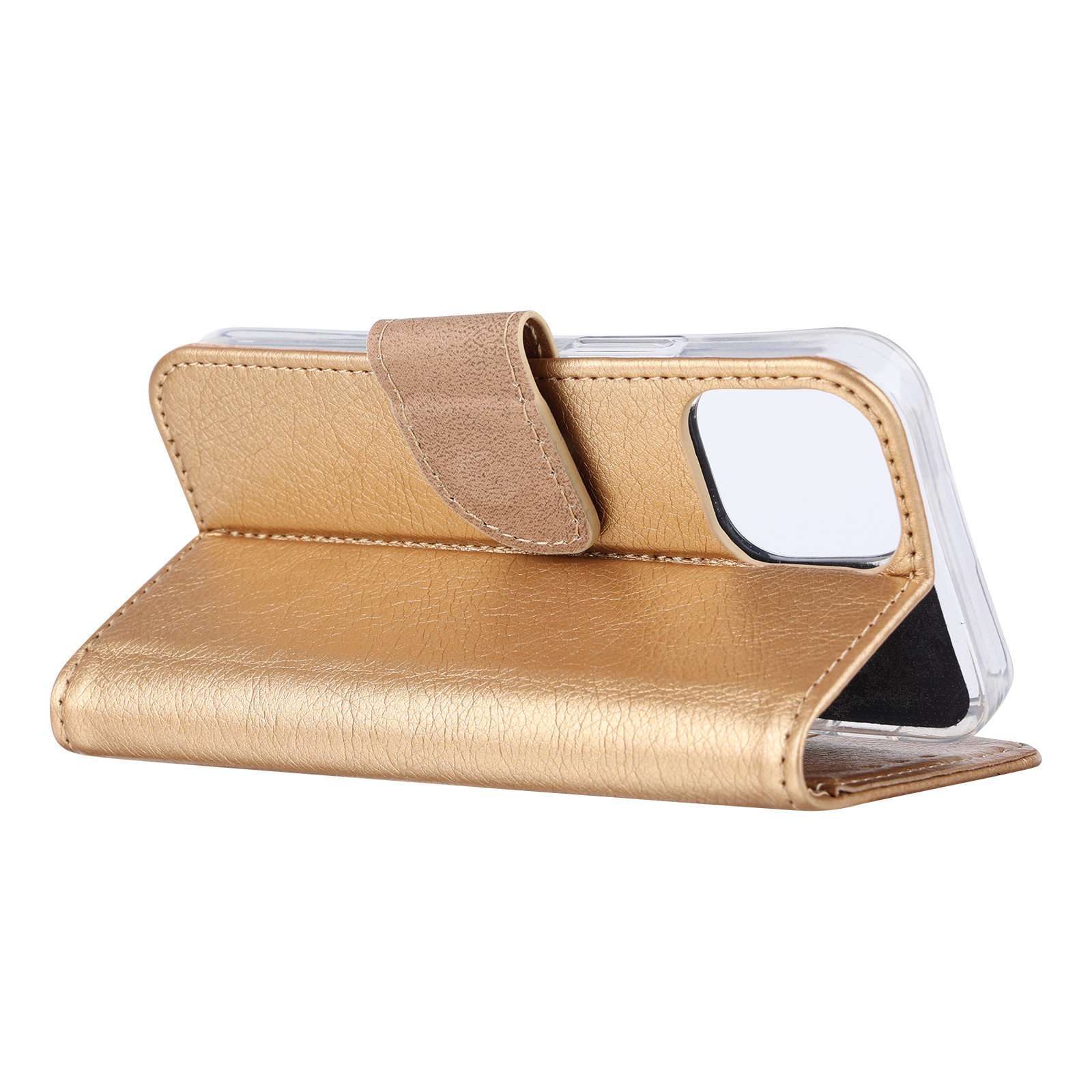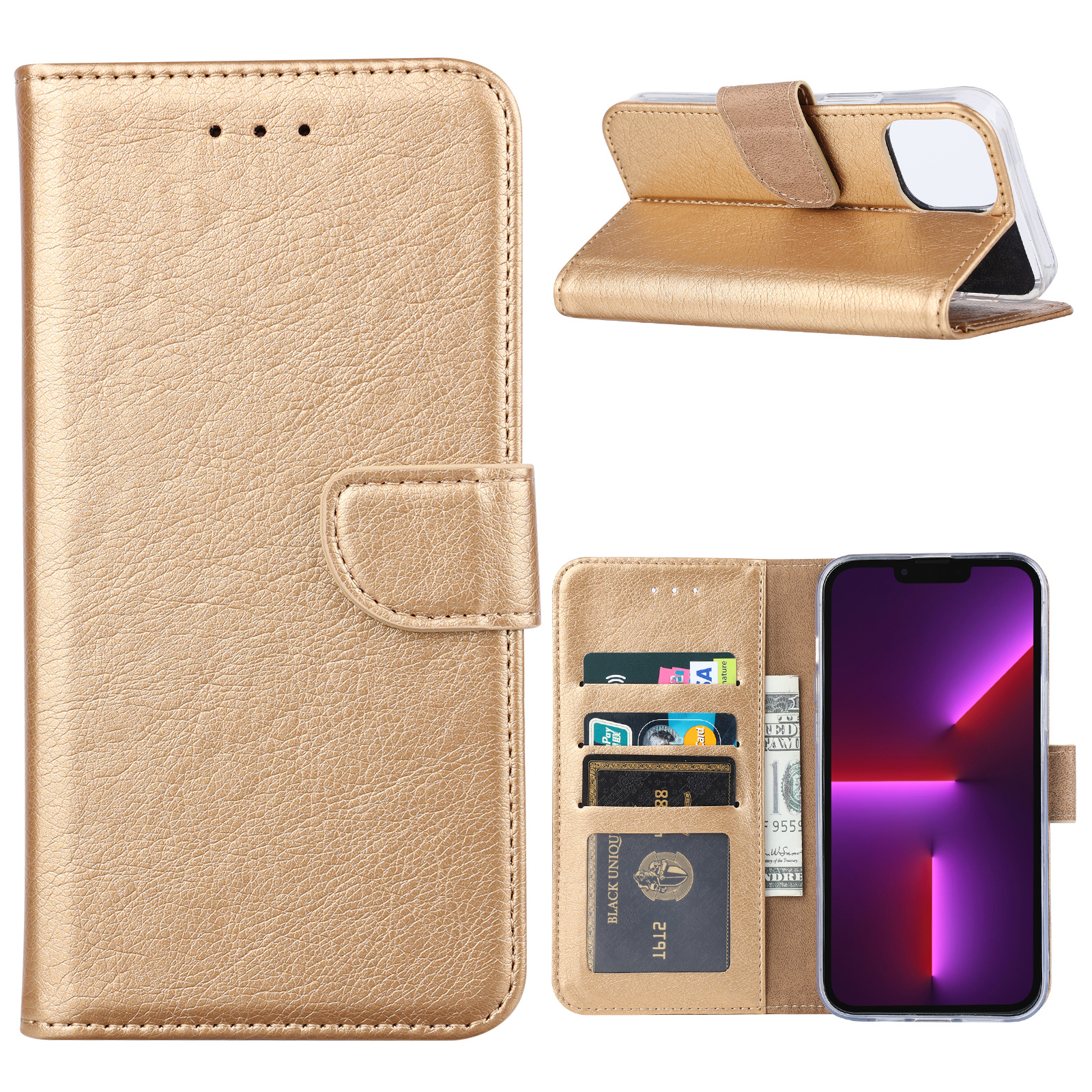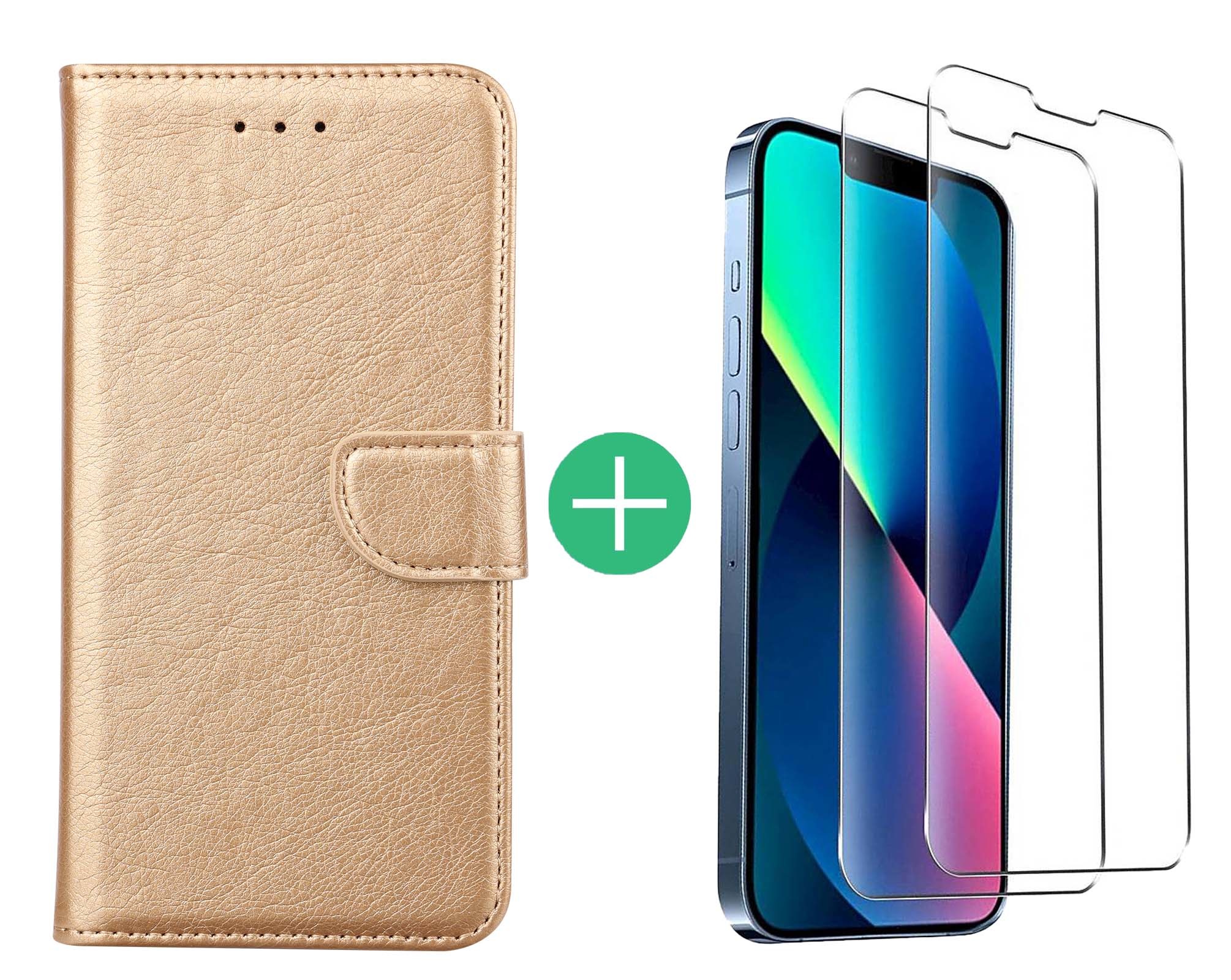 Hoesje Geschikt voor iPhone 13 Mini bookcase met 2 Pack Screenprotector gehard glas – Goud