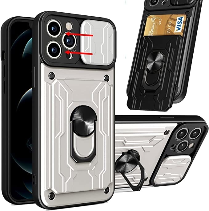 Geschikt voor iPhone 13 Pro hoesje met pashouder - camera bescherming cover en ring houder – Zilver – oTronica