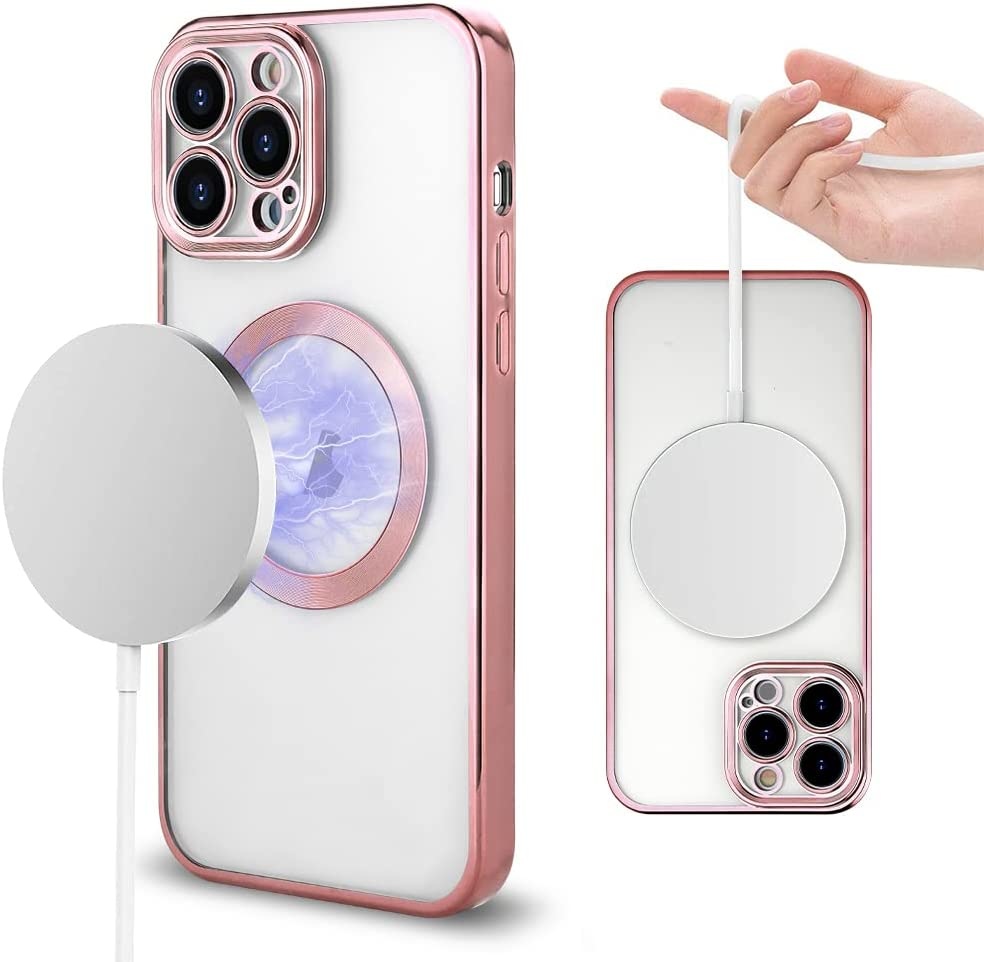 Hoesje Geschikt voor iPhone 13 Pro Max Magsafe hoes backcover – Lens beschermer – Transparant / Rosegoud