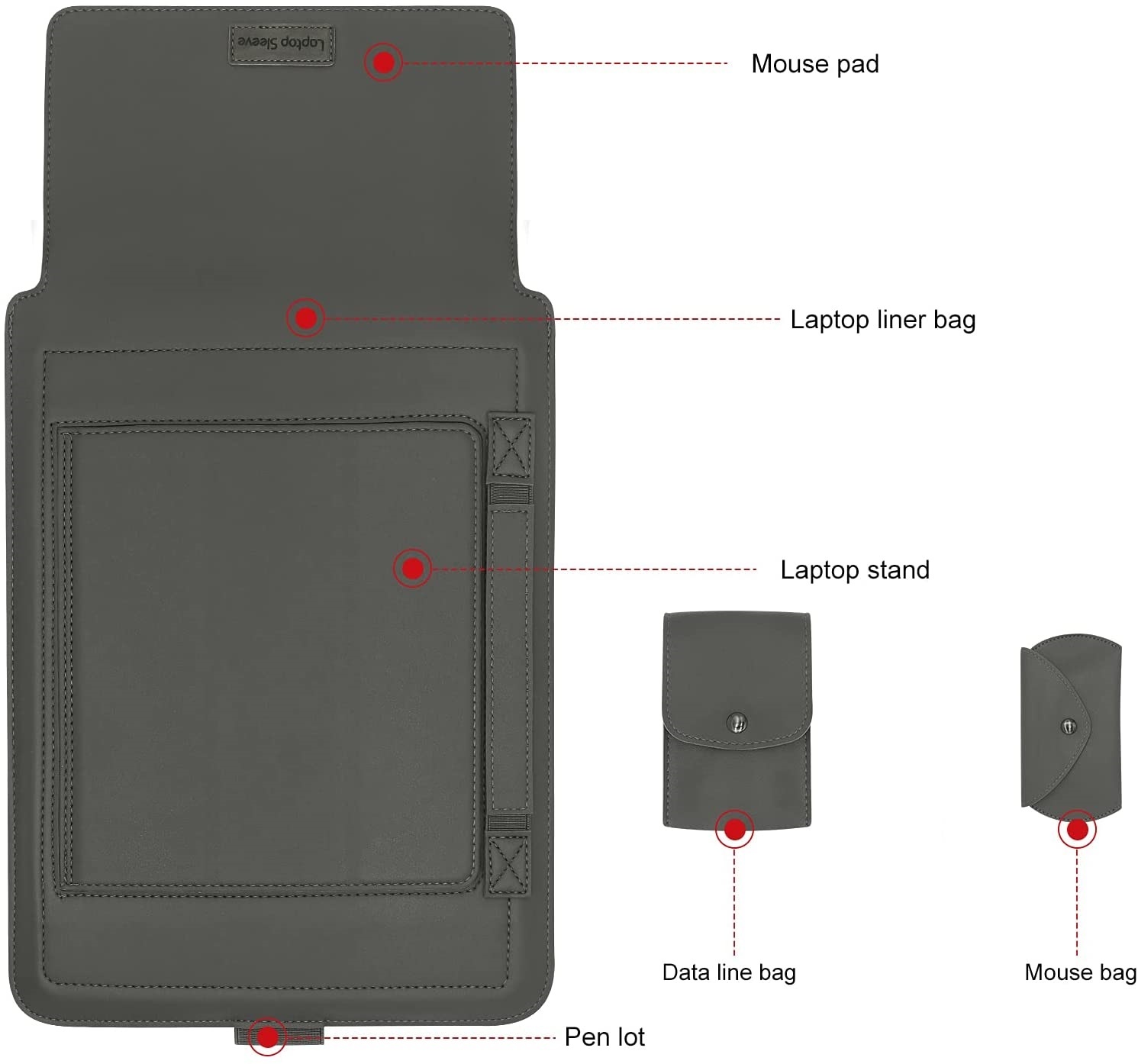 - 4 piece set: macbook sleeve, oplader tasje, muis tasje en kabel flapje