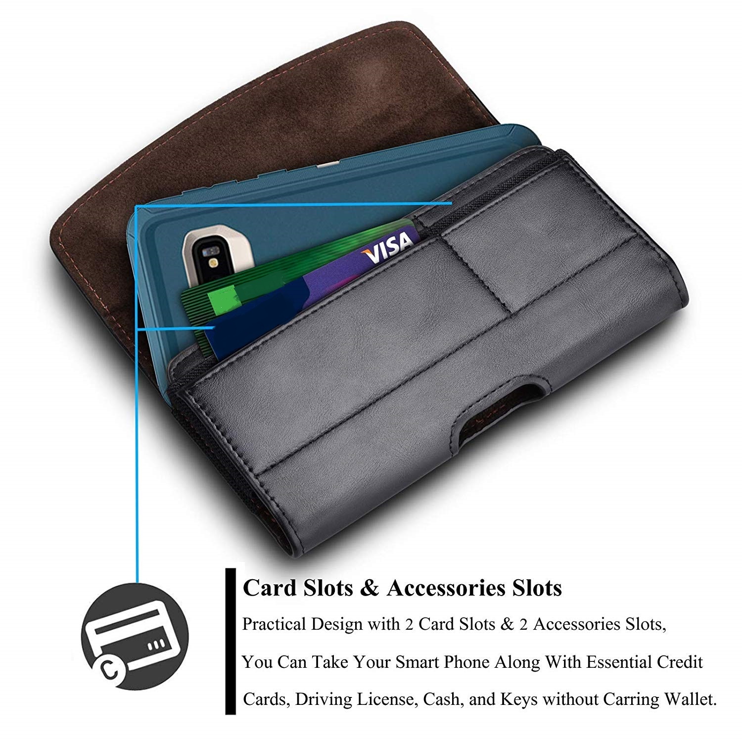 Dit luxe holster hoesje is perfect voor je smartphone en je kunt het altijd gebruiken. De mooie look en ruimte voor je pasjes maken het mogelijk dat je belangrijk pasjes ook handig naast je telefoon hebt liggen. Je kunt ook wat briefgeld of een belangrijke notitie erbij zetten dat je niet kwijt wilt raken.
