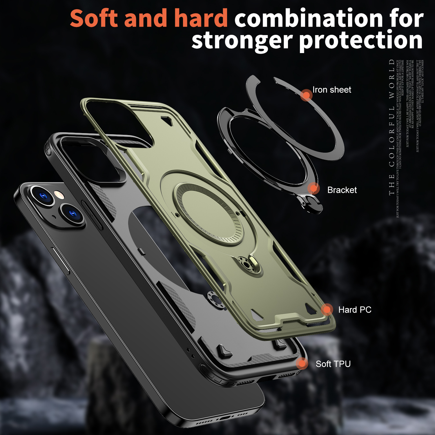 Magsafe Hoesje Geschikt voor iPhone 15 Hoesje Olijfgroen - Armor Hoesje met Met Draaibare Ring Houder