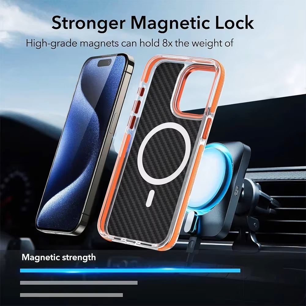 - De textuur van carbon fiber biedt niet alleen meer grip, maar voegt ook een premium uitstraling toe die de esthetiek van je iPhone aanvult.