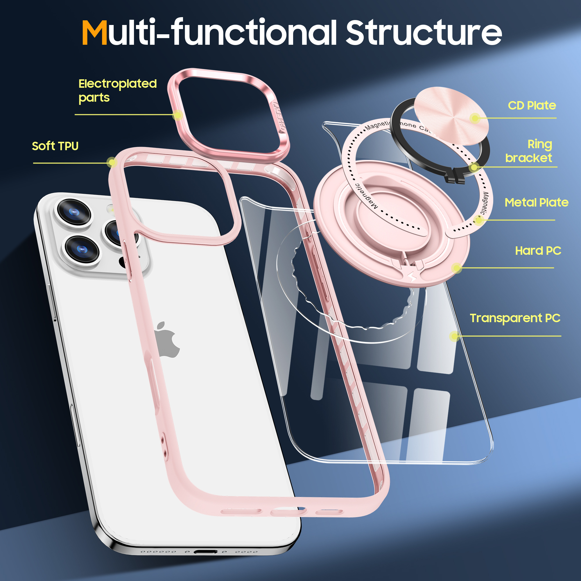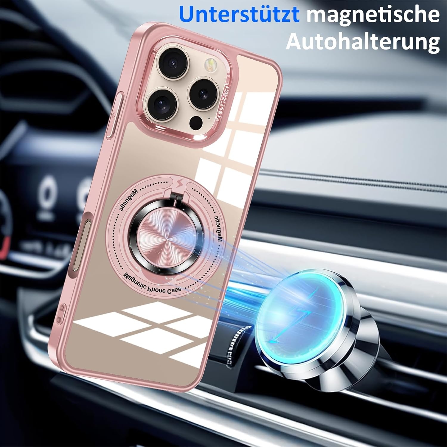 Magsafe Hoesje Geschikt voor iPhone 16 Pro Max hoesje Rose Goud Transparant - Met kickstand Draaibare Ring Houder