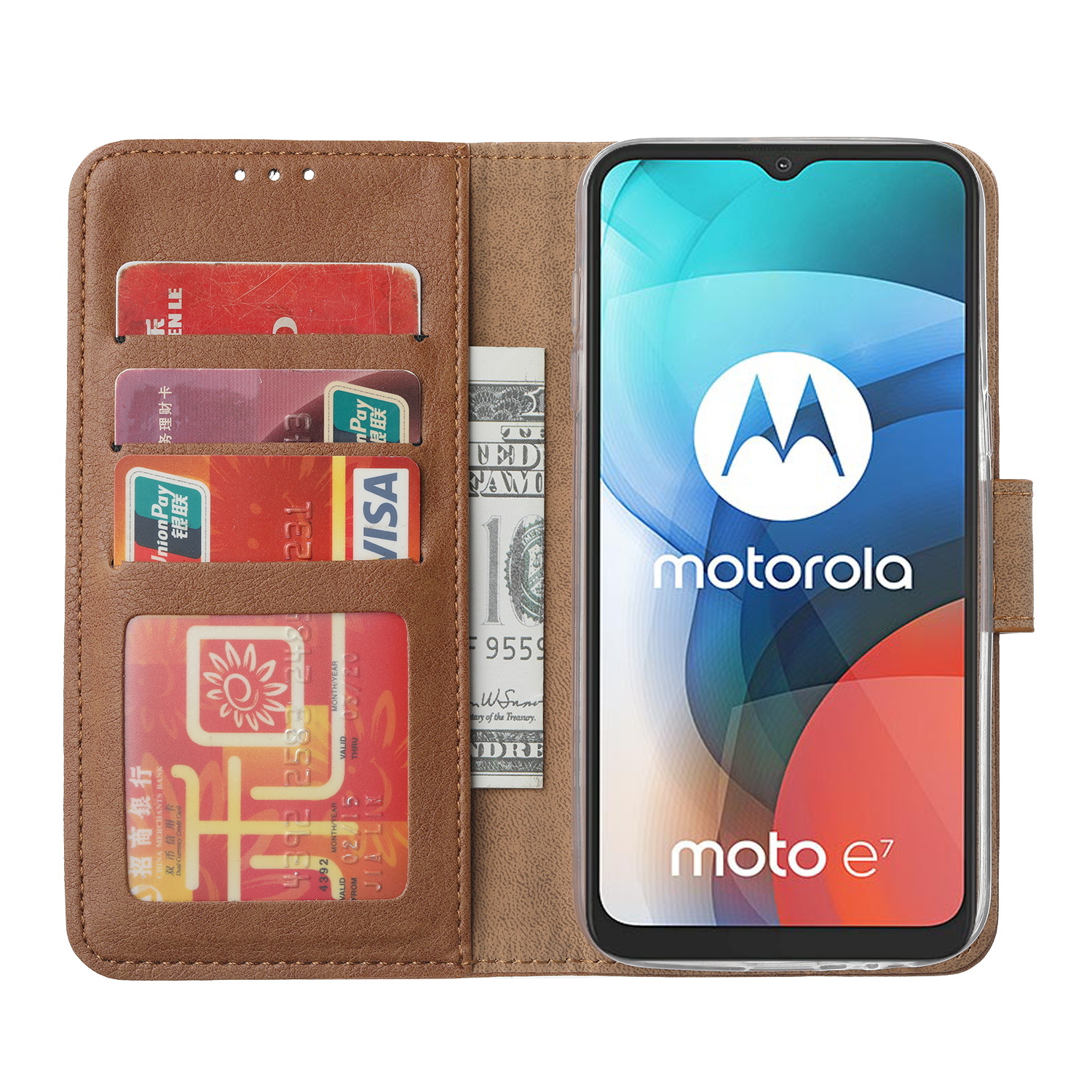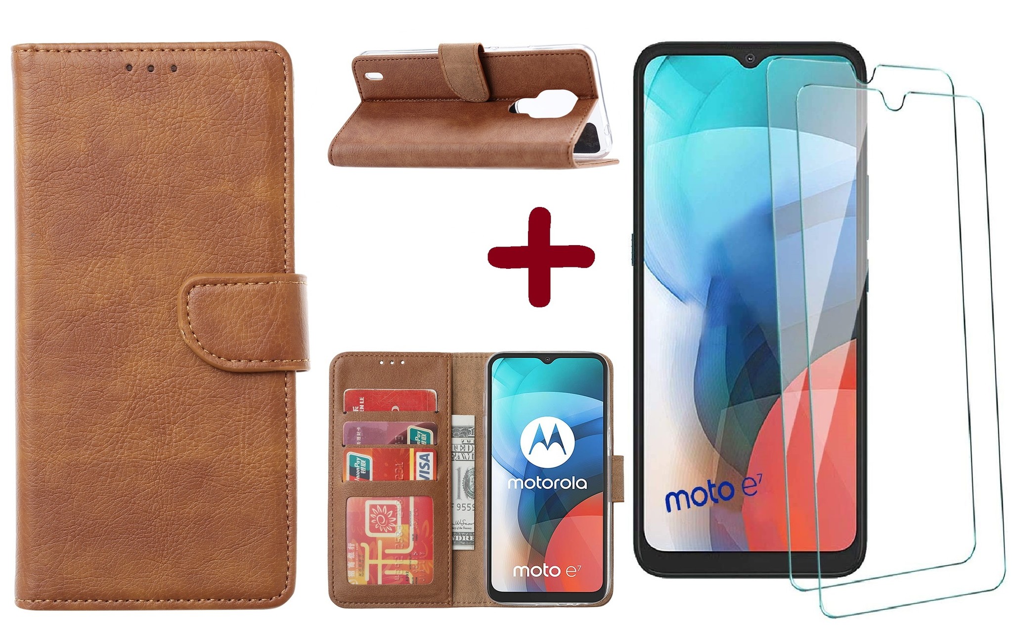 Geschikt voor Moto E7 hoesje - Geschikt voor Moto E7 wallet case portemonnee - Geschikt voor Moto E7 bookcase cover Bruin met - Geschikt voor Moto E7 screenprotector / 2 pack tempered glass
