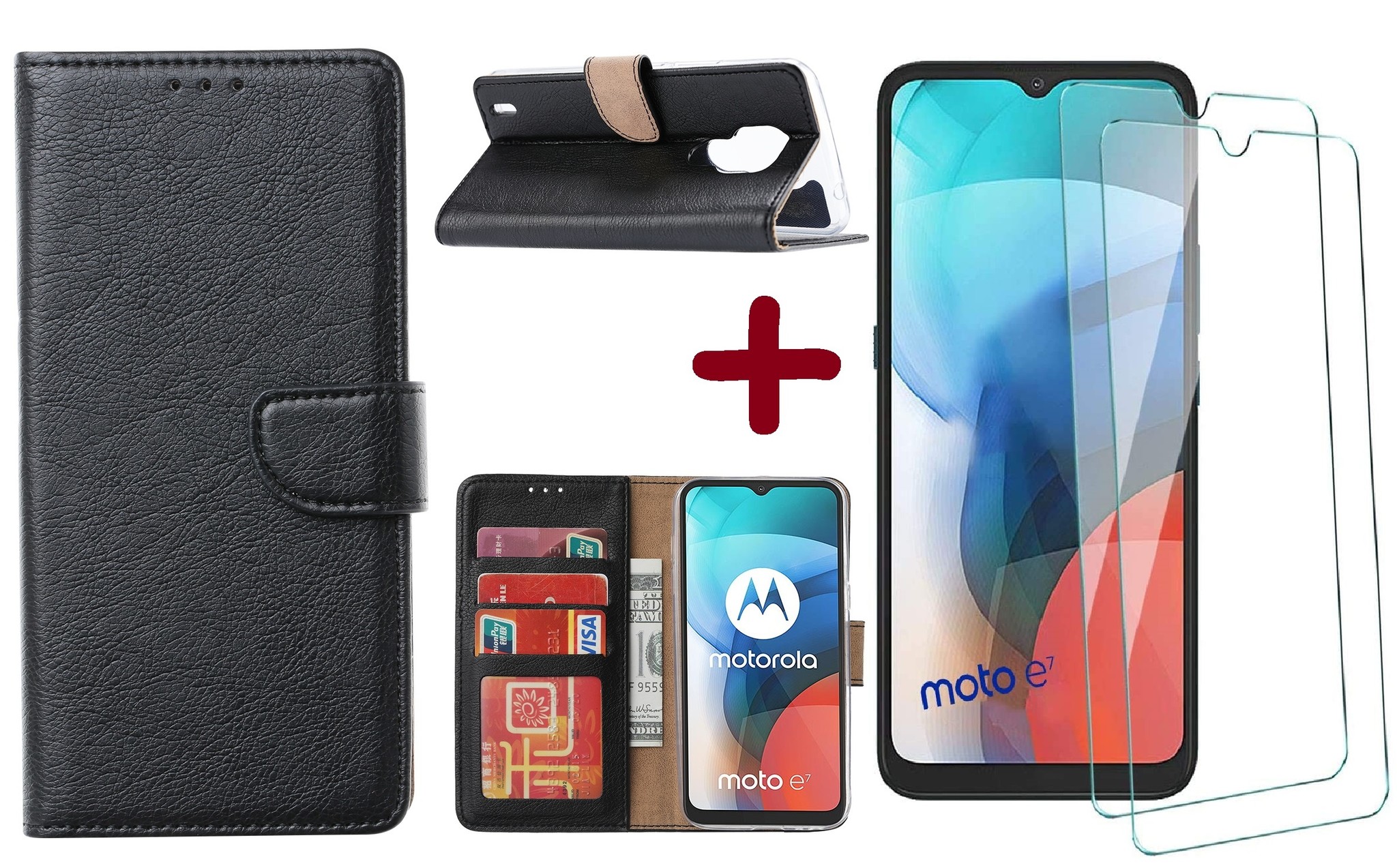 Geschikt voor Moto E7 hoesje - Geschikt voor Moto E7 wallet case portemonnee - Geschikt voor Moto E7 bookcase cover Zwart met - Geschikt voor Moto E7 screenprotector / 2 pack tempered glass