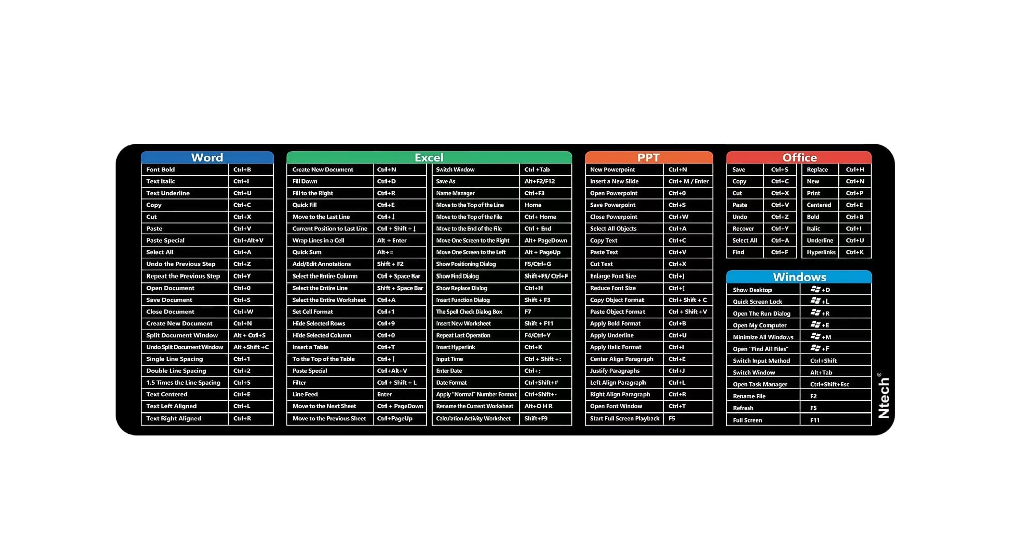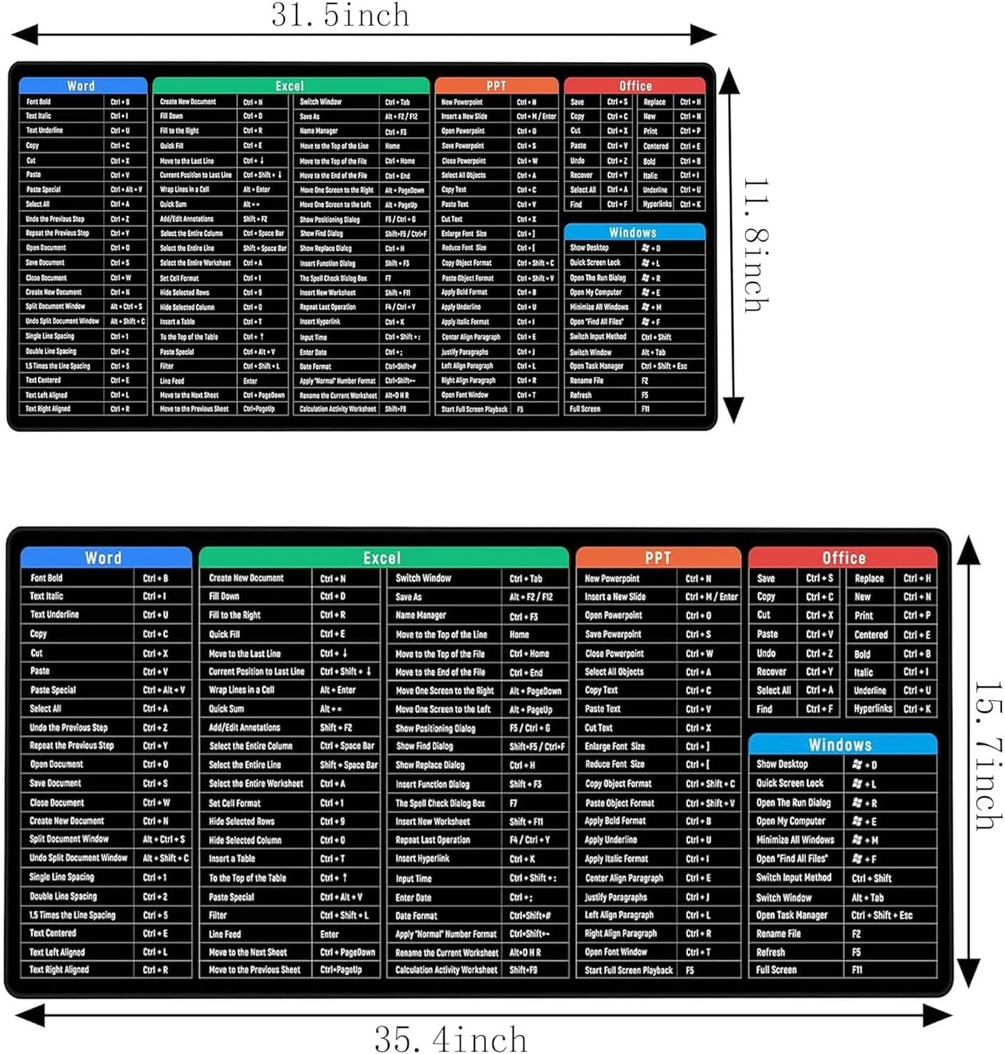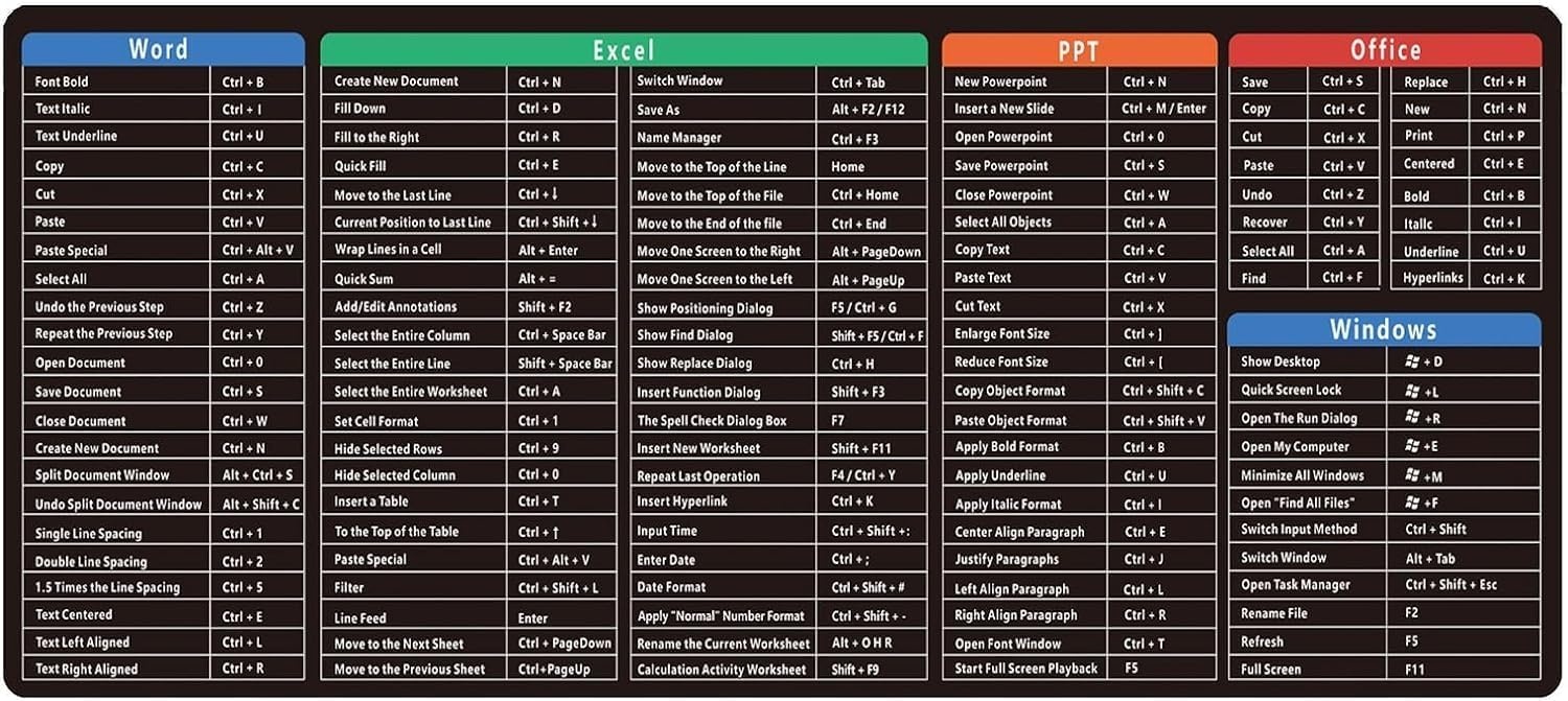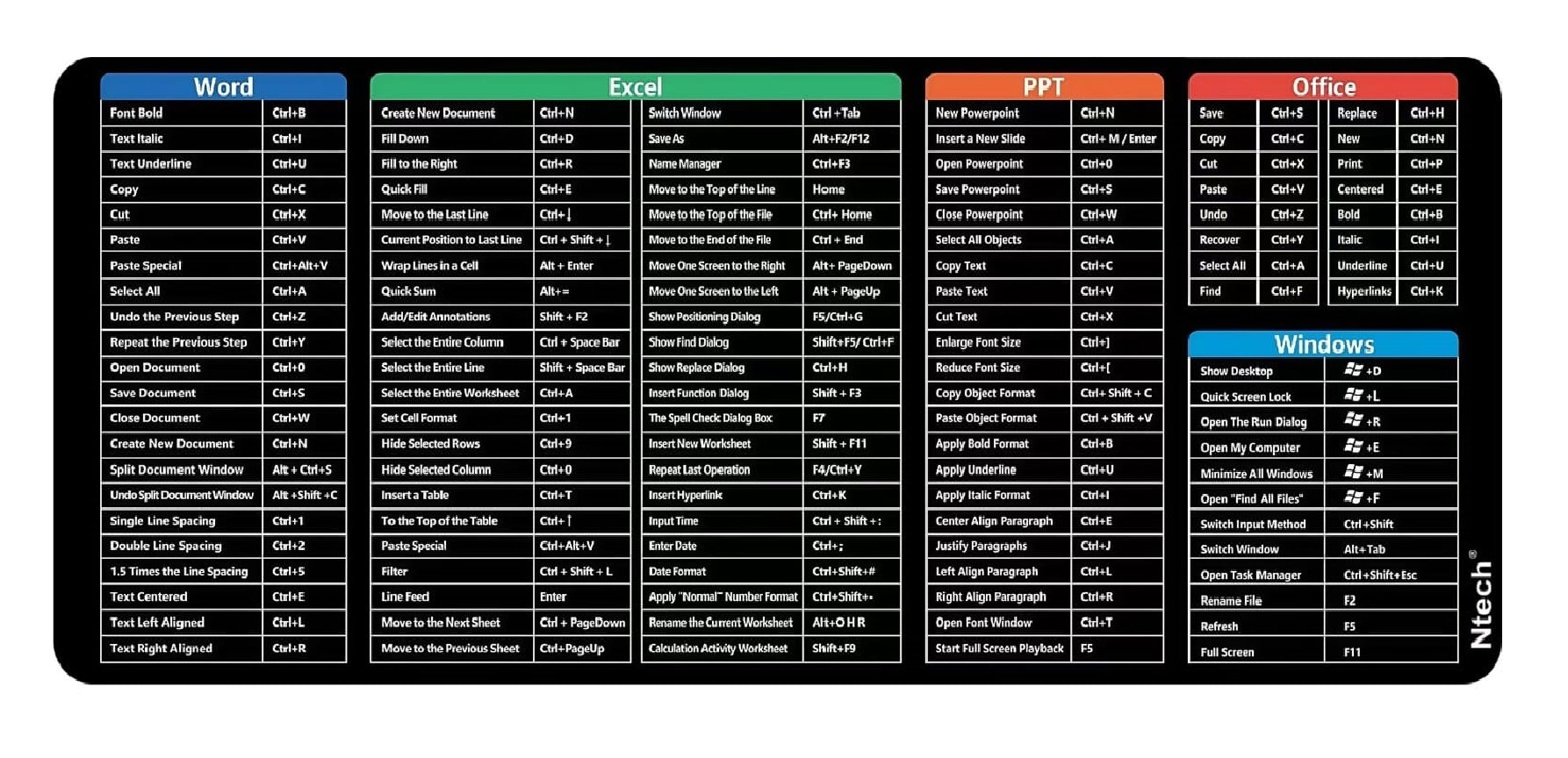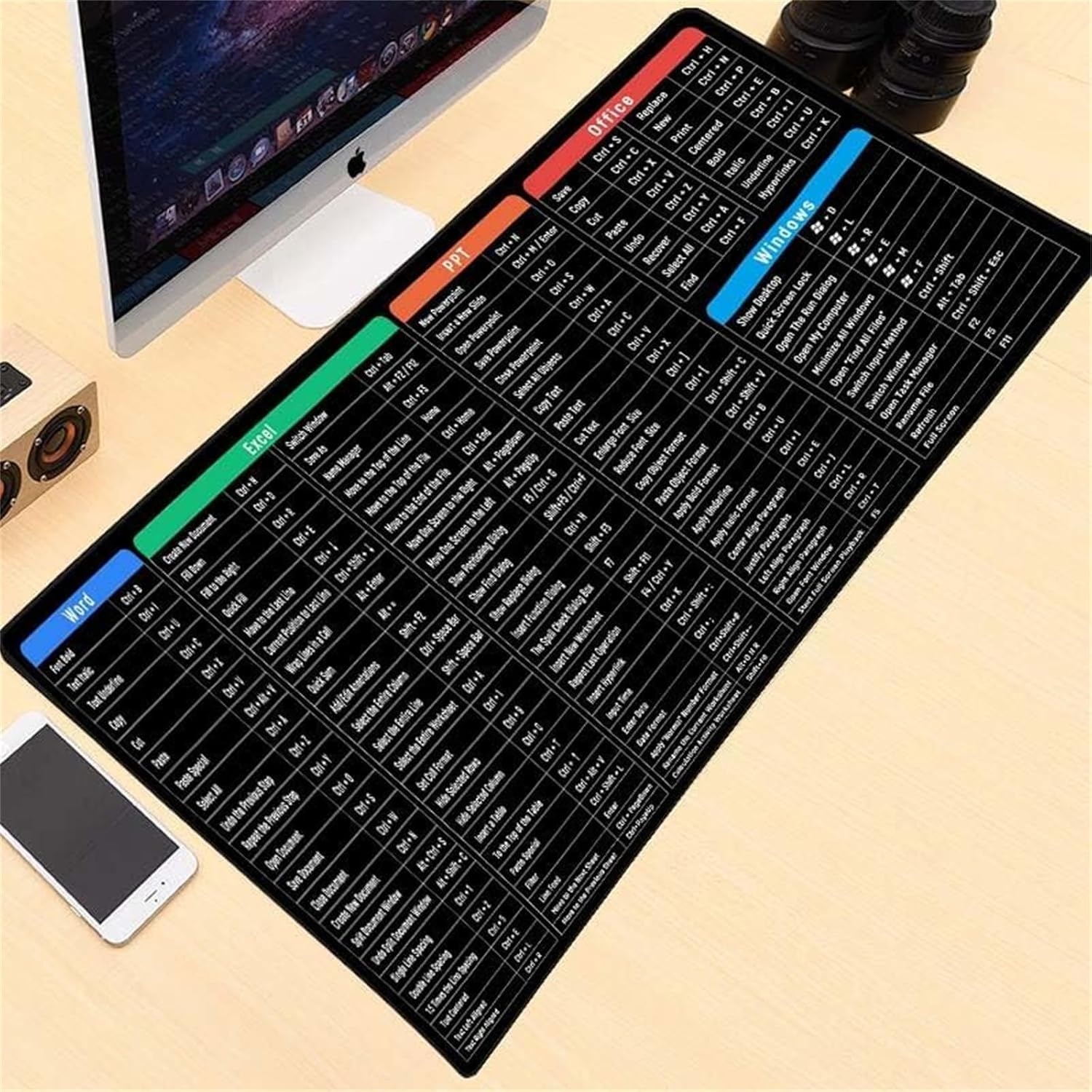 Ntech - Gaming muismat met Excel sneltoetsen - Grote en multifunctionele bureauonderlegger - Comfortabel en antislip - voor Toetsenbord en Muis