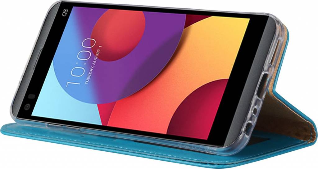 Je kunt bijvoorbeeld pasjes of briefgeld bewaren in dit boek hoesje. Dankzij de specifieke uitsparingen in dit boek hoesje (voor de camera, opladen, zijknopjes) kan je van jouw LG Q8 blijven genieten zonder dat de toestel uit het boek hoesje gehaald hoeft te worden. Dit boek hoesje maakt het mogelijk om jouw LG Q8 in horizontale stand neer te leggen om bijvoorbeeld een filmpje te kunnen kijken. Doordat er openingen aan de voorzijde in dit boek hoesje book case van jouw LG Q8 zitten, kan je met het hoesje gesloten bellen als je het gesprek hebt aangenomen.