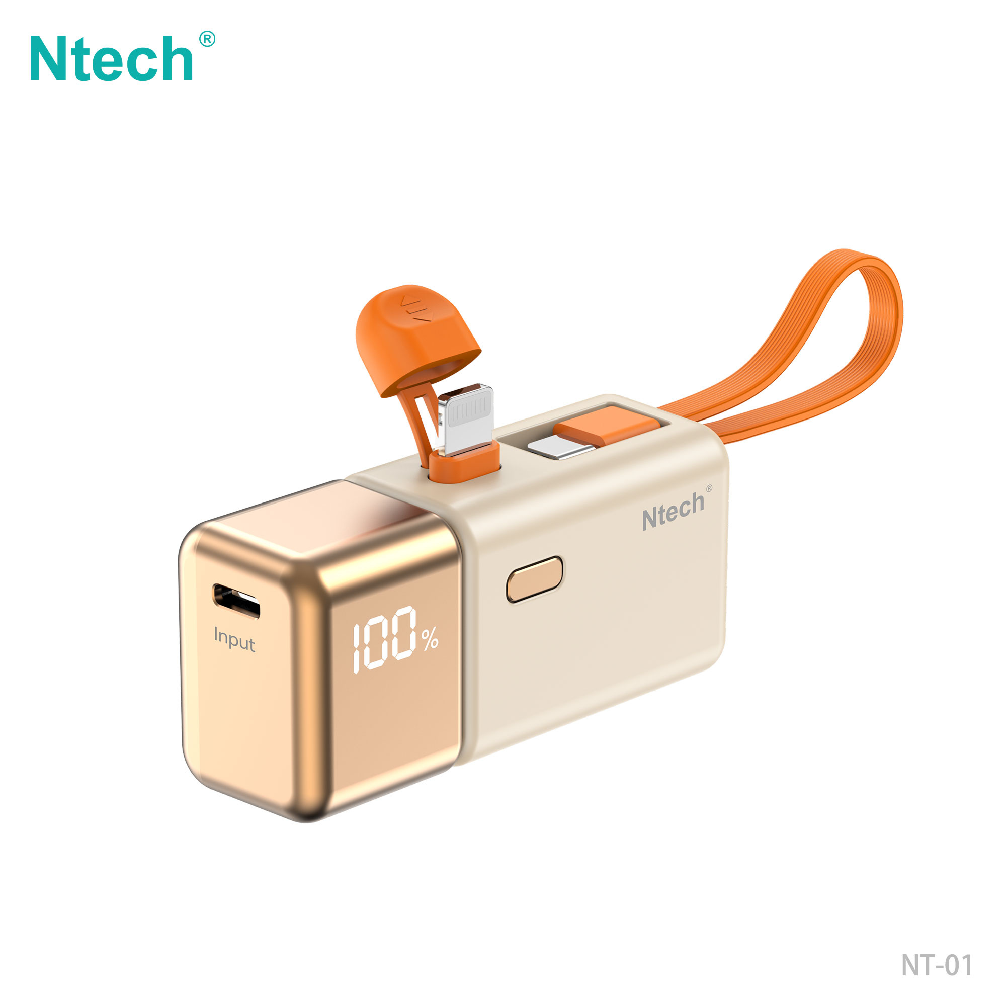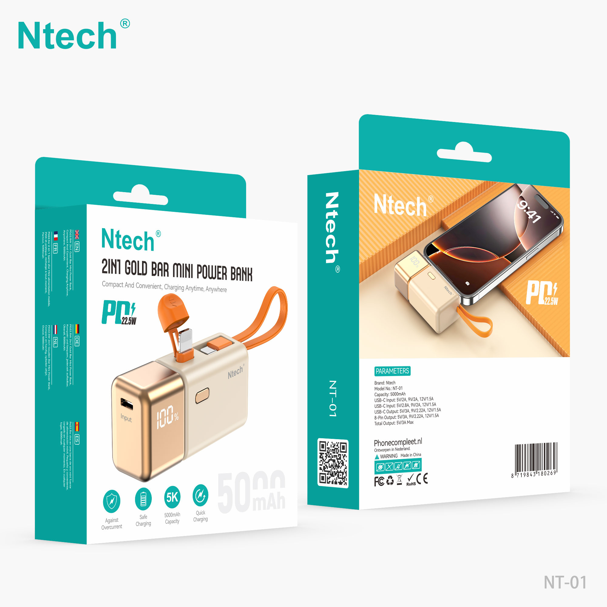 Ntech Mini Powerbank 5000mAh – Met ingebouwde Type-C kabel & digitaal display – Compacte snellader voor smartphone, tablet & oordopjes