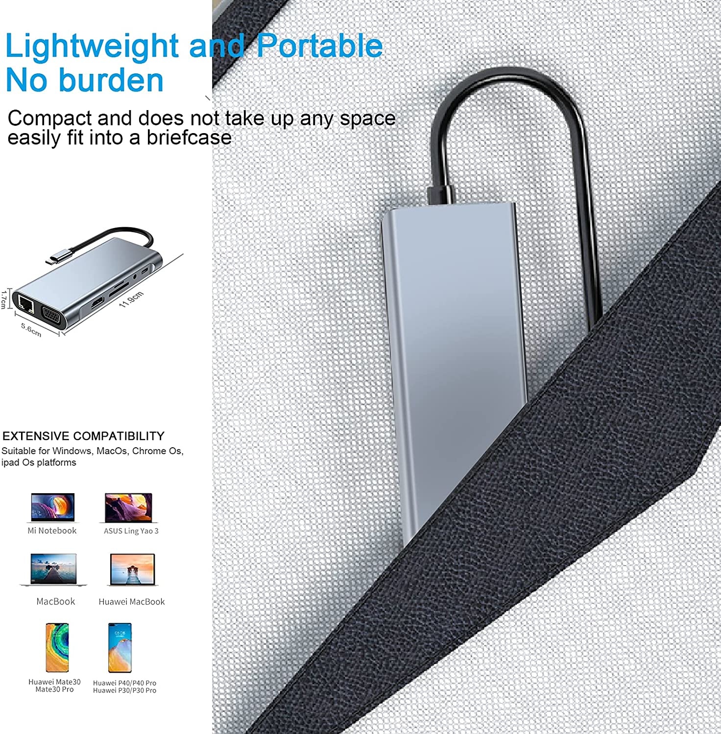 Beheer Alles in één USB-C Hub: De USB C Hub Adapter is compatibel met alle apparaten die Type-C / USB-poorten bevatten, met name MacBook Pro en Air. 11-in-1 USB C-HUB bevat een USB3.0 en drie USB2.0-poorten, een PD-poort, een 4K HDMI-video-uitgang, een VGA male-to-female-poort, een RJ45 Ethernet-poort en een Audio-uitgang, en SD / Micro SD-kaartlezer slots, compatibel met MacBook Pro / Air, Chromebook en andere Type-C-apparaten.