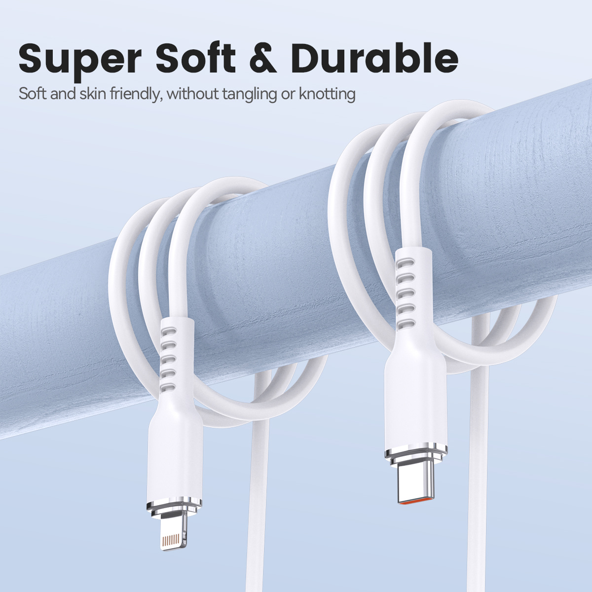 De kabel is vervaardigd uit hoogwaardig zacht siliconenmateriaal, wat zorgt voor uitstekende flexibiliteit en een comfortabele grip. Dankzij de soepele structuur raakt de kabel niet in de knoop, ideaal voor onderweg, op je bureau of in de auto. De siliconen buitenlaag is bovendien vuilafstotend, waardoor de kabel schoon blijft en er als nieuw uitziet, zelfs bij regelmatig gebruik.