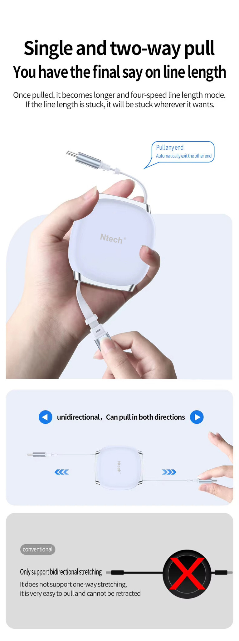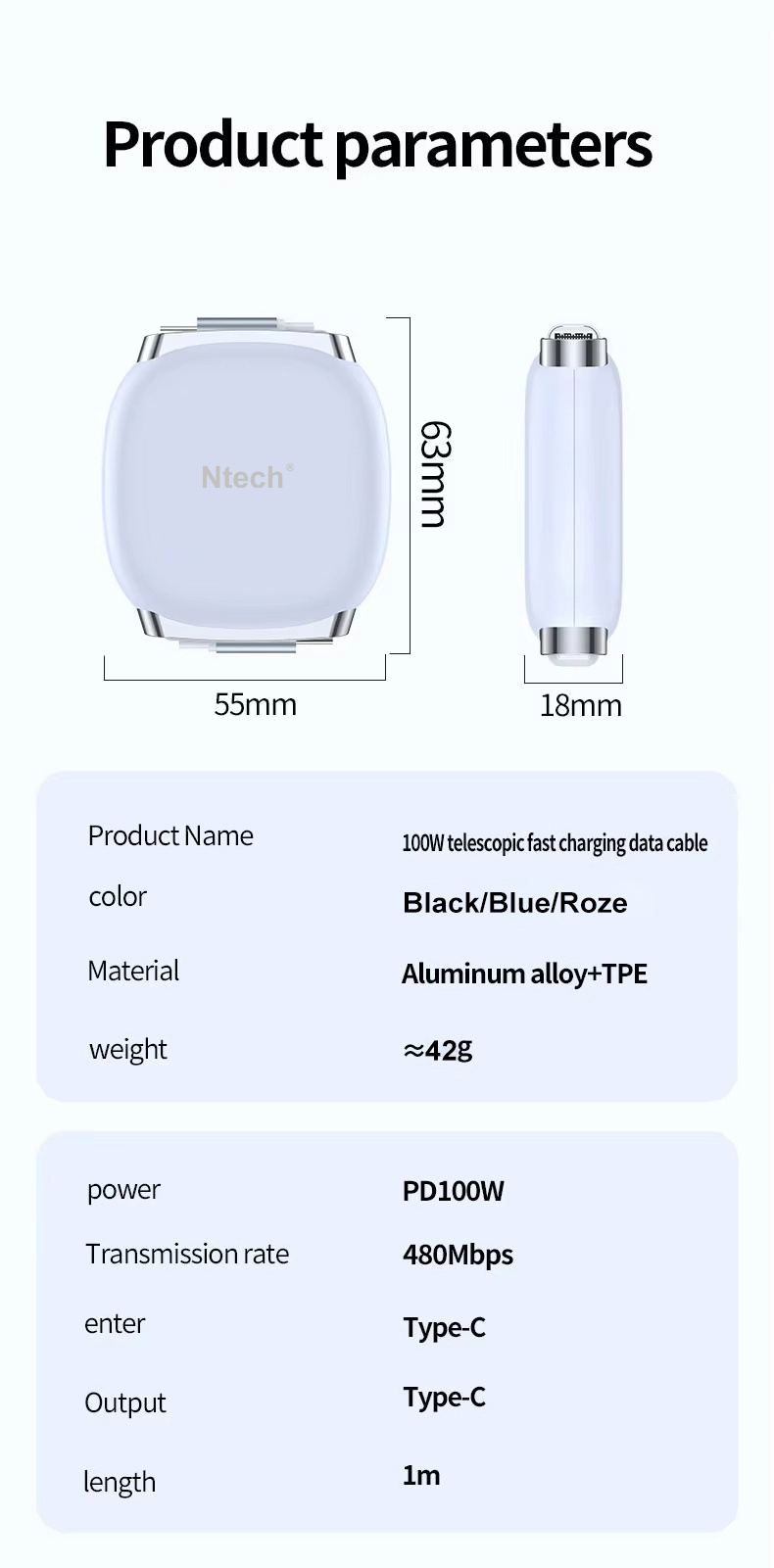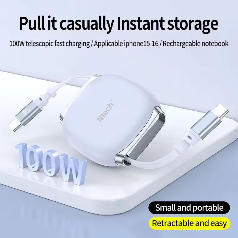 Ben je op zoek naar een krachtige, veelzijdige en ruimtebesparende oplaadkabel? De Ntech 100W Intrekbare USB-C naar USB-C Kabel combineert superieure prestaties met ultiem gebruiksgemak. Dankzij het slimme intrekbare ontwerp neem je de kabel overal mee naartoe zonder last te hebben van knopen of rommel in je tas. Perfect voor thuis, op kantoor of onderweg.