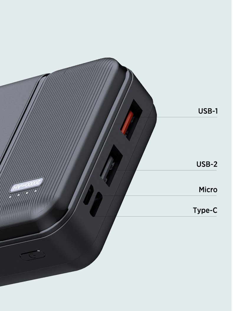Met een krachtige capaciteit van 20.000 mAh heb je genoeg power om je smartphone 2 tot 4 keer op te laden en je tablet eenmaal. Geen zorgen meer over lege batterijen tijdens belangrijke vergaderingen, lange reizen of spannende uitstapjes. Onze powerbank houdt je apparaten de hele dag moeiteloos opgeladen.